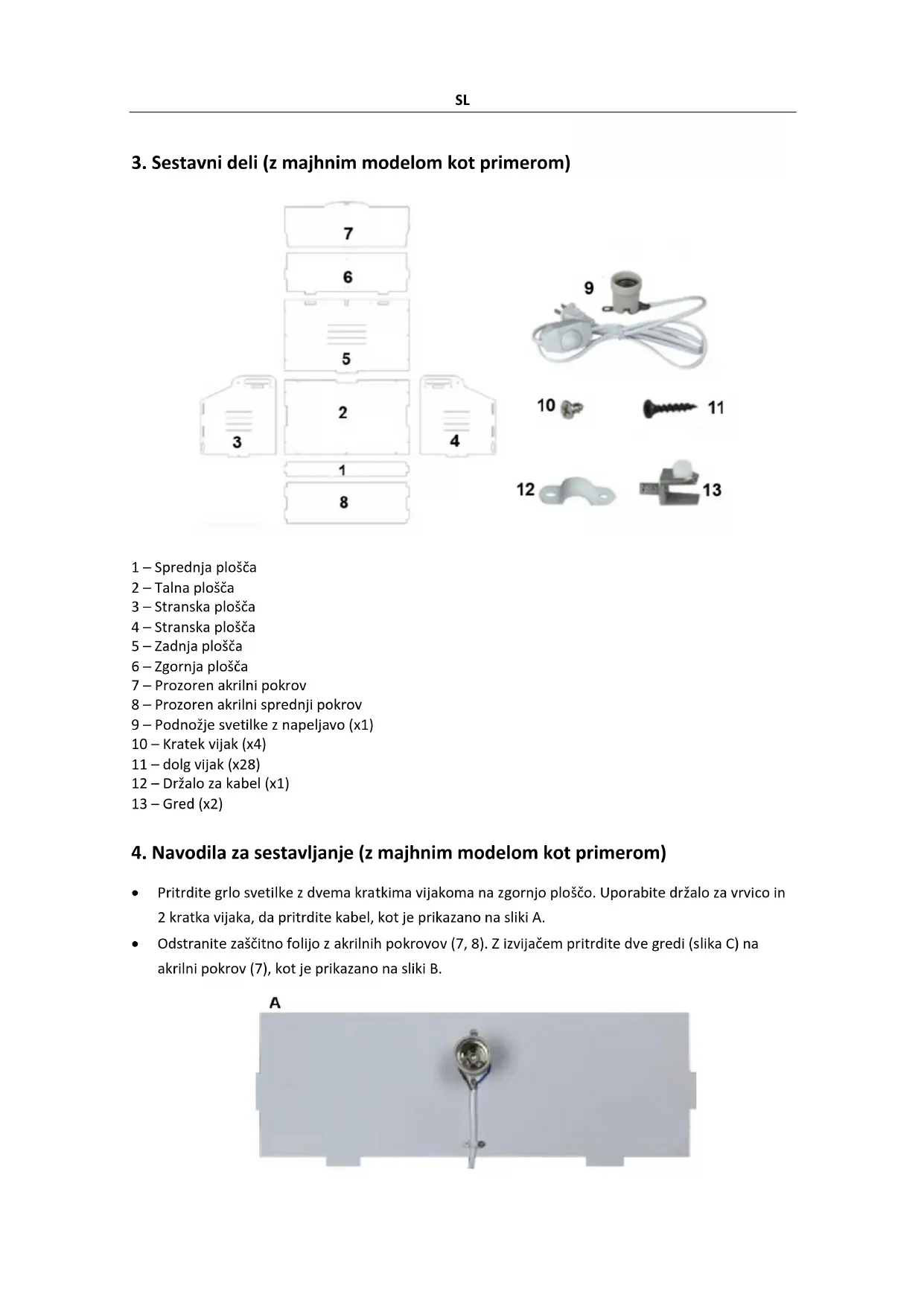 1 – Sprednja plošča 2 – Talna plošča 3 – Stranska plošča 4 – Stranska plošča 5 – Zadnja plošča 6 – Zgornja plošča 7 – Prozoren akrilni pokrov 8 – Prozoren akrilni sprednji pokrov 9 – Podnožje svetilke z napeljavo (x1) 10 – Kratek vijak (x4) 11 – dolg vijak (x28) 12 – Držalo za kabel (x1) 13 – Gred (x2)