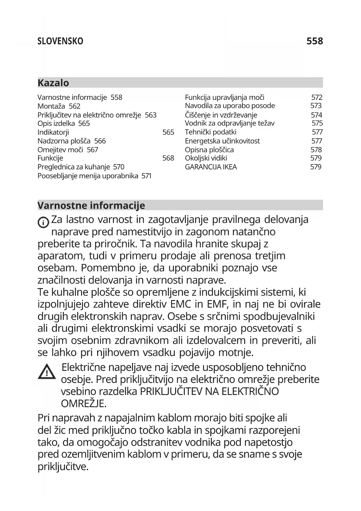 Kuhalno ploščo odklopite z napajanja. Počakajte nekaj sekund, nato kuhalno ploščo znova priklopite na napajanje. Če se težava še vedno pojavlja, se obrnite na službo za tehnično podporo in navedite oznako napake, ki se prikaže na prikazovalniku.576 SLOVENSKO Vzdrževanjeinpopravila - Preverite, da je vzdrževanje električnih komponent zaupano izključno proizvajalcu ali servisnim tehnikom. - Preverite, da poškodovane kable zamenja le proizvajalec ali serviser. V primeru okvare poskusite težavo rešiti tako, da sledite navodilom za odpravljanje težav. Če težave ni mogoče rešiti, se obrnite na trgovino IKEA ali poprodajno službo. Celoten seznam servisnih centrov, ki jih je imenovala IKEA in povezani kontaktni podatki so na zadnji strani tega priročnika. Ko stopite v stik s službo za tehnično podporo, podajte naslednje informacije: - vrsta okvare - model aparata (Art./Kod.) - serijska številka (S.ŠT.) Te informacije so na podatkovni ploščici. Podatkovna ploščica je na dnu naprave. V primeru neustrezne uporabe ali kadar namestitve ni izvedel pooblaščeni serviser, se lahko obisk tehnika servisne službe ali trgovine zaračuna tudi v obdobju veljavnosti garancije.577 SLOVENSKO Tehničkipodatki Enota Vrednost Vrsta izdelka Vgrajena kuhalna plošča Mere Širina mm