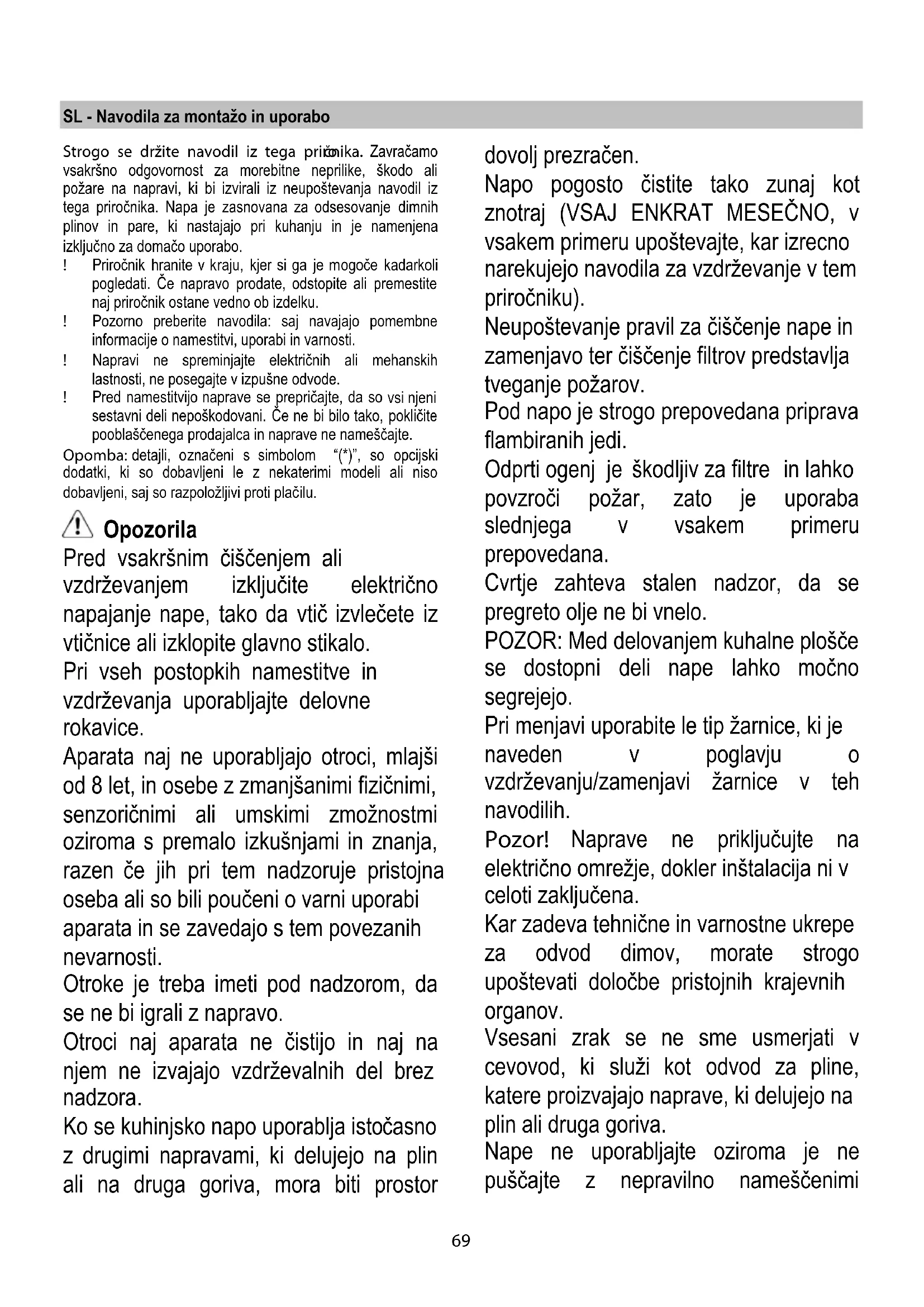 zmanjšajte hrup. Uporaba Napa je izdelana za uporabo v odzračevalni različici z zunanjim odvodom ali obtočni oz. filtracijski z notranjim obtokom. Odzračevalna različica Napa ima en zgornji izhod zraka B za zunanji odvod dimov (odvodna cev in pritrdilni jermeni niso priloženi). Povežite napo s cevmi in odprtinami z vodoravnim odtokom enakega premera kot je premer izhoda za zrak (spojna prirobnica). Uporaba cevi in odprtin z vodoravnim odtokom, ki imajo manjši premer, bo vplivala na zmanjšanje uèinkov sesanja in moèno poveèala hrupnost. Zato za tako delovanje odklanjamo vsakršno odgovornost. Opozorilo! Če je napa opremljena s ltrom na oglje, ga morate sneti. Filtracijska različica V primeru, da ni možno odvajanje dimov in hlapov na prosto, lahko uporabite napo v ltracijski različi ci. Na kamin nape namestite deflektor F ter enega ali več filtrov (glede na model nape). Zrak se reciklira in preko zgornje rešetkaste odprtine H vrača v kuhinjo. Opozorilo! Če napa ni opremljena s ltrom z ogljem, morate le-tega naročiti in ga pred uporabo namestiti. Modeli brez sesalnega motorja delujejo le v odzračevalni različici in morajo biti povezani na periferno sesalno enoto (ni priložena). Navodila za prikljuèitev veljajo za celotno periferno sesalno enoto.71 Inštalacija Slika 3 Minimalna razdalja med podporno površino posod na kuhalni površini in spodnjim delom nape za kuhinjske prostore ne sme biti manjša od 55 cm pri elektri čnih štedilnikih in 65 cm pri plinskih ali mešanih štedilnikih. Če je v navodilih za instalacijo plinskega kuhalnika napisana večja razdalja, jo je treba tudi upoštevati. Električna povezava Omrežna napetost mora ustrezati napetosti, navedeni na nalepki z lastnostmi, nameščeni v notranjosti nape. Če ima napa vtič, slednjega vstavite v vtičnico, ki je skladna z veljavnimi predpisi in se nahaja na takem mestu, ki bo dostopno tudi po vgradnji naprave. Če napa nima vtiča (neposredna povezava na omrežje) ali se vtič nahaja na takem mestu, ki po vgradnji naprave ne bi bilo dostopno, namestite dvopolno stikalo, skladno s predpisi, ki zagotavlja popoln izklop iz omrežja v pogojih prenapetostnega razreda III, skladno s predpisi o inštalaciji. Pozor! pred ponovnim priklopom tokokroga nape na omrežno napajanje in kontrolo pravilnega delovanja, vselej preverite, ali je omrežni kabel pravilno nameščen. Pozor! Zamenjavo napajalnega kabla mora izvesti pooblaščena servisna služba, tako da se prepreči vsakršno tveganje. Montaža Napi so priloženi pritrdilni vložki, primerni za večji del sten/stropov. Vseeno pa se je treba obrniti na usposobljenega tehnika, ki vam bo potrdil ustreznost materialov glede na vrsto stene/stropa. Stena/Strop morata biti dovolj trdna, da lahko prenašata težo nape.