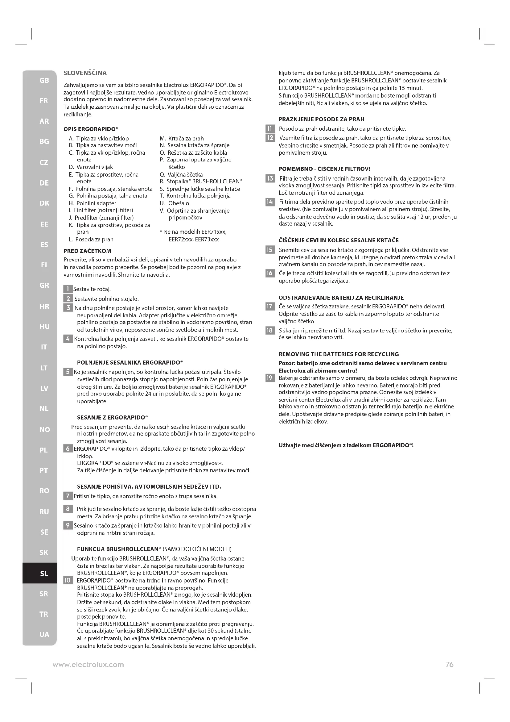 Pozor: baterijo sme odstraniti samo delavec v servisnem centru Electrolux ali zbirnem centru! 19 Baterije odstranite samo v primeru, da boste izdelek odvrgli. Nepravilno rokovanje z baterijami je lahko nevarno. Baterije morajo biti pred odstranitvijo vedno popolnoma prazne. Odnesite svoj izdelek v servisni center Electrolux ali v uradni zbirni center za reciklažo. Tam lahko varno in strokovno odstranijo ter reciklirajo baterijo in električne dele. Upoštevajte državne predpise glede zbiranja polnilnih baterij in električnih izdelkov. Uživajte med čiščenjem z izdelkom ERGORAPIDO®! 76www.electrolux.com