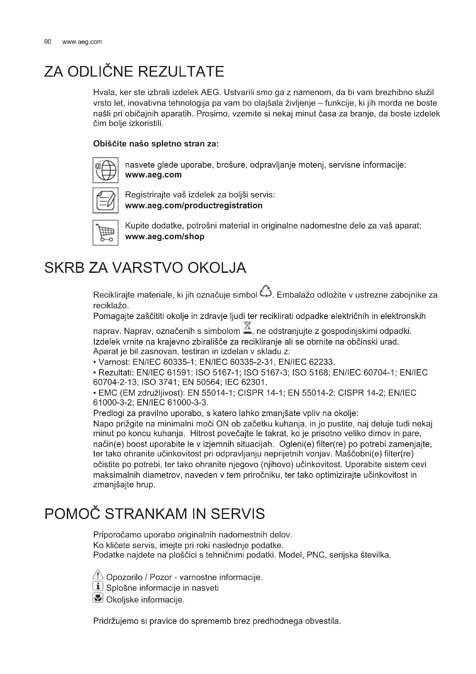 Priporočamo uporabo originalnih nadomestnih delov. Ko kličete servis, imejte pri roki naslednje podatke. Podatke najdete na ploščici s tehničnimi podatki. Model, PNC, serijska številka. Opozorilo / Pozor - varnostne informacije. Splošne informacije in nasveti Okoljske informacije. Pridržujemo si pravice do sprememb brez predhodnega obvestila.