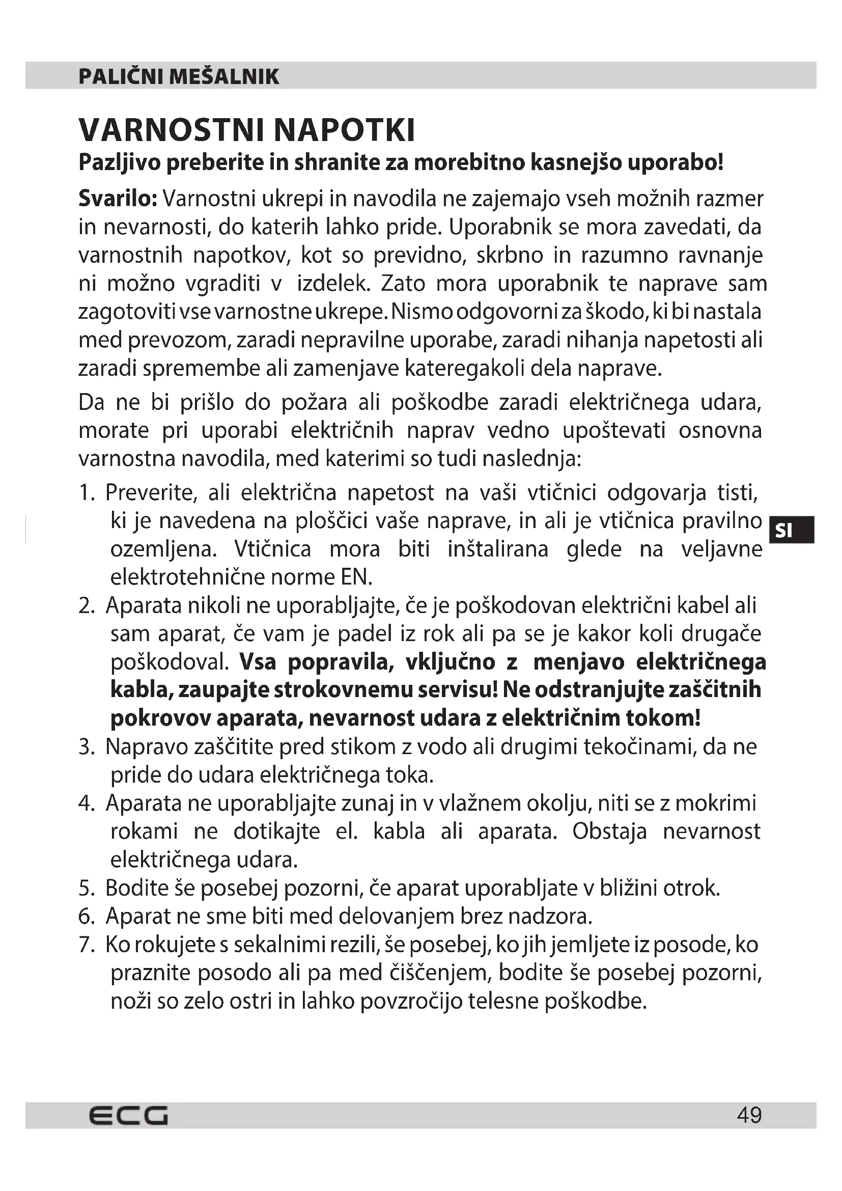 Odstranjevanje električne in elektronske opreme (velja za države članice Evropske unije in druge evropske države, ki izvajajo sistem recikliranja).Simbol na izdelku ali embalaži pomeni, da se izdelek ne sme obravnavati kot komunalni odpadek. Dostaviti izdelek na lokacijo, namenjeno za recikliranje električne in elektronske opreme. Preprečite negativni vpliv na zdravje ljudi in okolje z pravilnim recikliranjem izdelka. Recikliranje ohranja naravne vire. Za več informacij orecikliranju tega izdelka se lahko obrnite na lokalne oblasti, lokalne organizacije ali trgovino, kjer ste izdelek kupili. Ta izdelek je vskladu zEU zahtevami oelektromagnetni skladnosti in električni varnosti. Pridržujemo si pravico do urejanja besedila in tehničnih parametrov. Navodila za uporabo so na razpolago na spletnih straneh www.ecg-electro.eu.