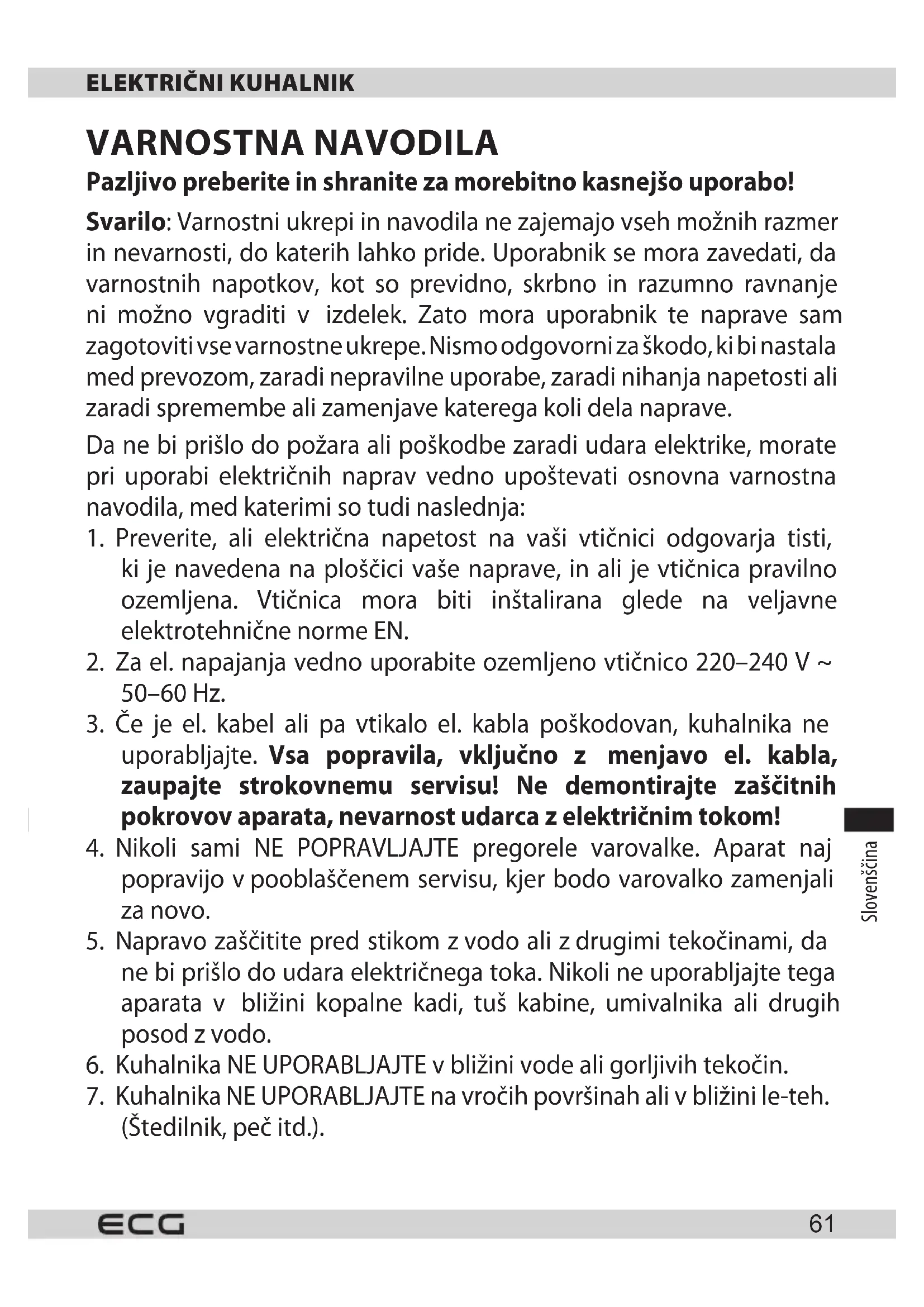 Odstranjevanje električne in elektronske opreme (velja za države članice Evropske unije in druge evropske države, ki izvajajo sistem recikliranja).Simbol na izdelku ali embalaži pomeni, da se izdelek ne sme obravnavati kot komunalni odpadek. Dostaviti izdelek na lokacijo, namenjeno za recikliranje električne in elektronske opreme. Preprečite negativni vpliv na zdravje ljudi in okolje z pravilnim recikliranjem izdelka. Recikliranje ohranja naravne vire. Za več informacij orecikliranju tega izdelka se lahko obrnite na lokalne oblasti, lokalne organizacije ali trgovino, kjer ste izdelek kupili. Ta izdelek je vskladu zEU zahtevami oelektromagnetni skladnosti in električni varnosti. Pridržujemo si pravico do urejanja besedila in tehničnih parametrov. Navodila za uporabo so na razpolago na spletnih straneh www.ecg-electro.eu. 08/05Srpski Crnogorski Srpski Crnogorski