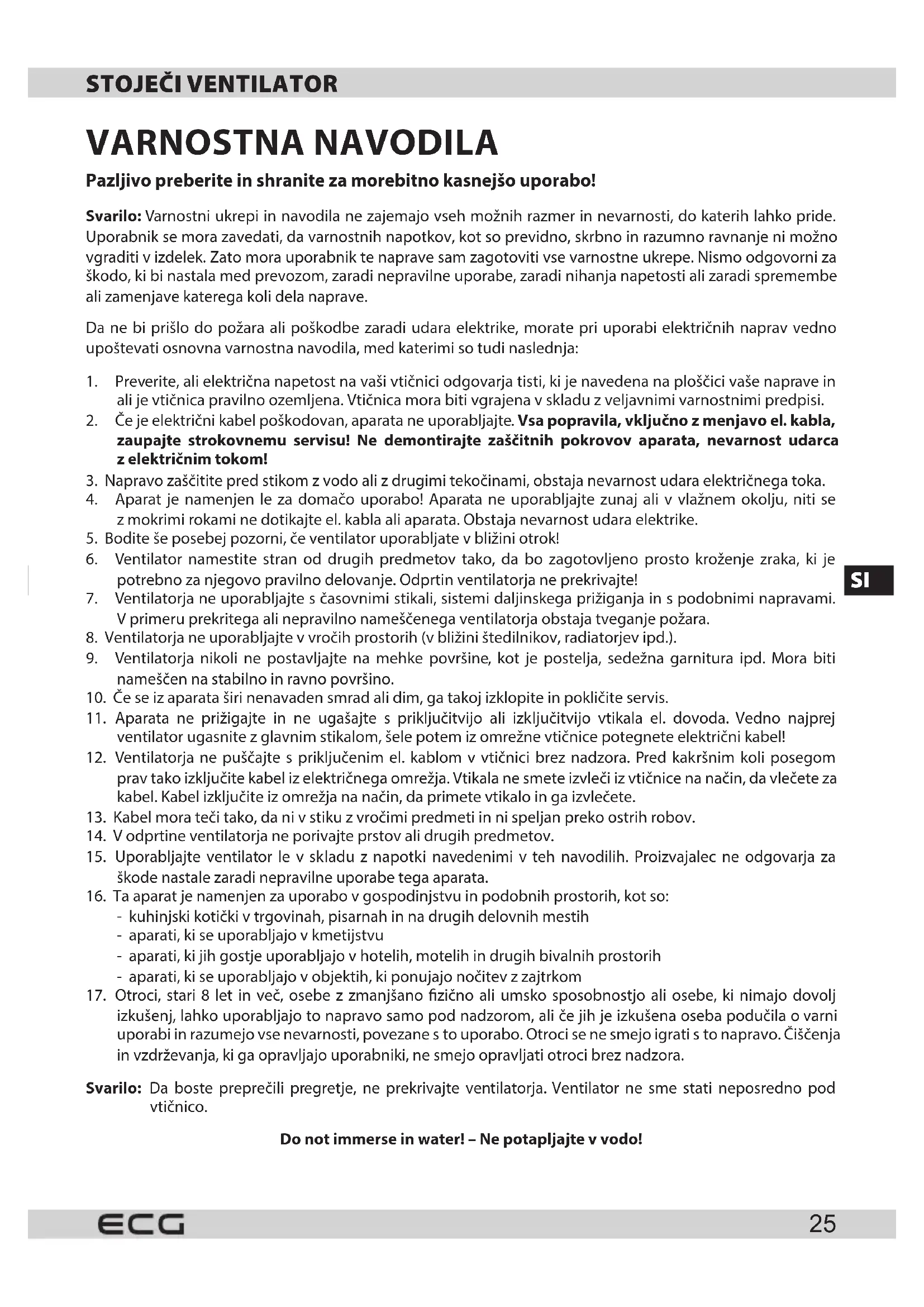 izkušenj, lahko uporabljajo to napravo samo pod nadzorom, ali če jih je izkušena oseba podučila ovarni uporabi in razumejo vse nevarnosti, povezane sto uporabo. Otroci se ne smejo igrati sto napravo. Čiščenja in vzdrževanja, ki ga opravljajo uporabniki, ne smejo opravljati otroci brez nadzora. Svarilo: Da boste preprečili pregretje, ne prekrivajte ventilatorja. Ventilator ne sme stati neposredno pod vtičnico. Do not immerse in water! – Ne potapljajte vvodo!SI