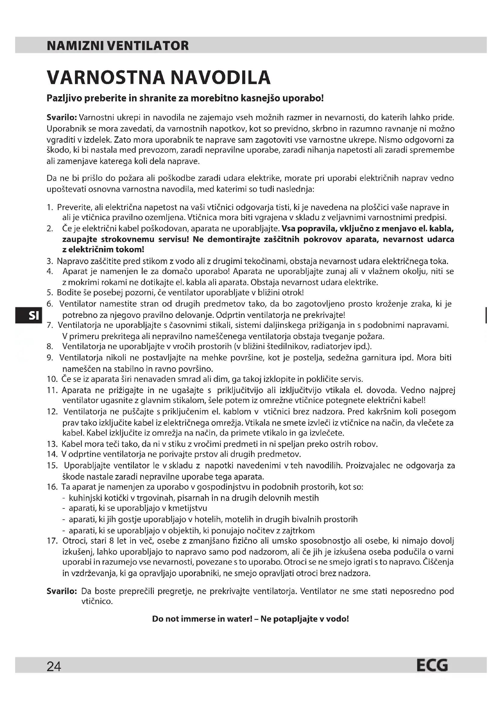 izkušenj, lahko uporabljajo to napravo samo pod nadzorom, ali če jih je izkušena oseba podučila ovarni uporabi in razumejo vse nevarnosti, povezane sto uporabo. Otroci se ne smejo igrati sto napravo. Čiščenja in vzdrževanja, ki ga opravljajo uporabniki, ne smejo opravljati otroci brez nadzora. Svarilo: Da boste preprečili pregretje, ne prekrivajte ventilatorja. Ventilator ne sme stati neposredno pod vtičnico. Do not immerse in water! – Ne potapljajte vvodo!SI
