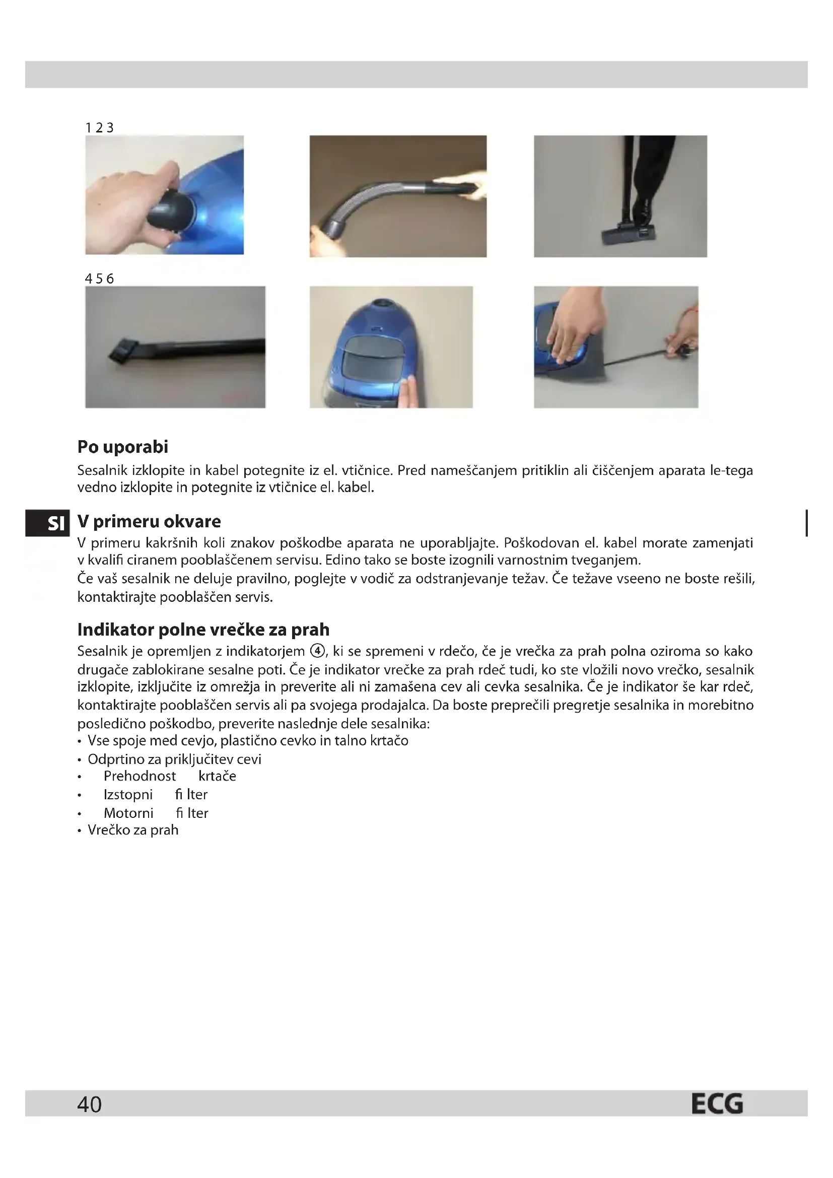 Po uporabi Sesalnik izklopite in kabel potegnite iz el. vtičnice. Pred nameščanjem pritiklin ali čiščenjem aparata le-tega vedno izklopite in potegnite iz vtičnice el. kabel. V primeru okvare V primeru kakršnih koli znakov poškodbe aparata ne uporabljajte. Poškodovan el. kabel morate zamenjati vkvali ciranem pooblaščenem servisu. Edino tako se boste izognili varnostnim tveganjem. Če vaš sesalnik ne deluje pravilno, poglejte vvodič za odstranjevanje težav. Če težave vseeno ne boste rešili, kontaktirajte pooblaščen servis. Indikator polne vrečke za prah Sesalnik je opremljen zindikatorjem 4, ki se spremeni vrdečo, če je vrečka za prah polna oziroma so kako drugače zablokirane sesalne poti. Če je indikator vrečke za prah rdeč tudi, ko ste vložili novo vrečko, sesalnik izklopite, izključite iz omrežja in preverite ali ni zamašena cev ali cevka sesalnika. Če je indikator še kar rdeč, kontaktirajte pooblaščen servis ali pa svojega prodajalca. Da boste preprečili pregretje sesalnika in morebitno posledično poškodbo, preverite naslednje dele sesalnika: