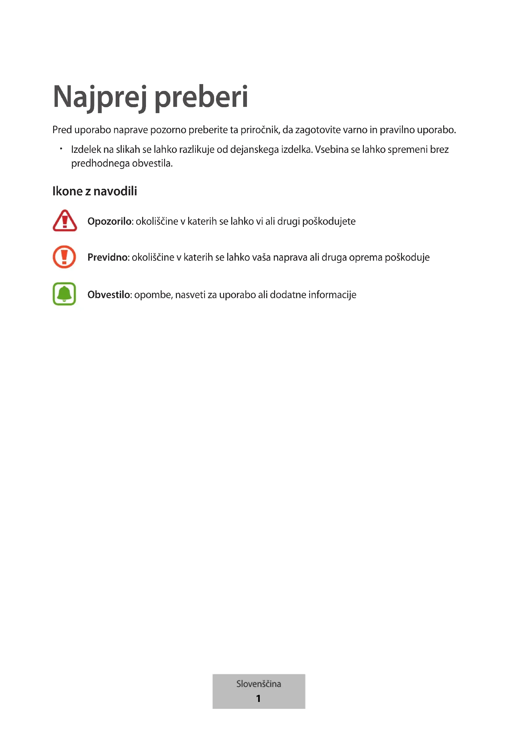 Izdelek na slikah se lahko razlikuje od dejanskega izdelka. Vsebina se lahko spremeni brez predhodnega obvestila. Ikone z navodili Opozorilo: okoliščine v katerih se lahko vi ali drugi poškodujete Previdno: okoliščine v katerih se lahko vaša naprava ali druga oprema poškoduje Obvestilo: opombe, nasveti za uporabo ali dodatne informacije Slovenščina