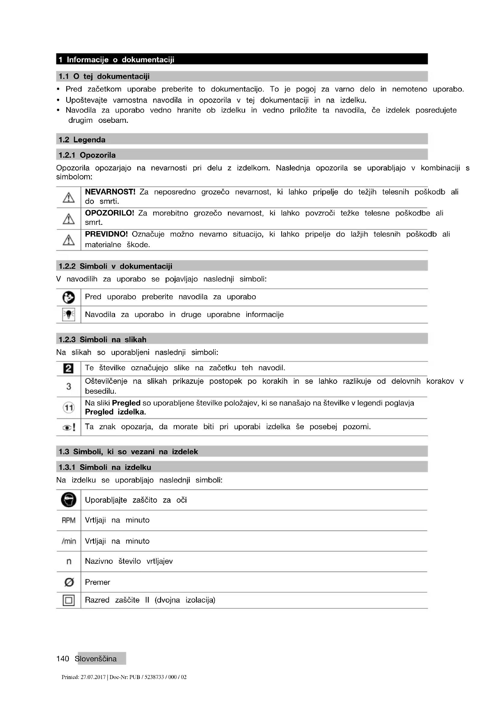 Na izdelku se uporabljajo naslednji simboli: Uporabljajte zaščito za oči Vrtljaji na minuto Vrtljaji na minuto Nazivno število vrtljajev Premer Razred zaščite II (dvojna izolacija) Printed: 27.07.2017 | Doc-Nr: PUB / 5238733 / 000 / 02Slovenščina 141