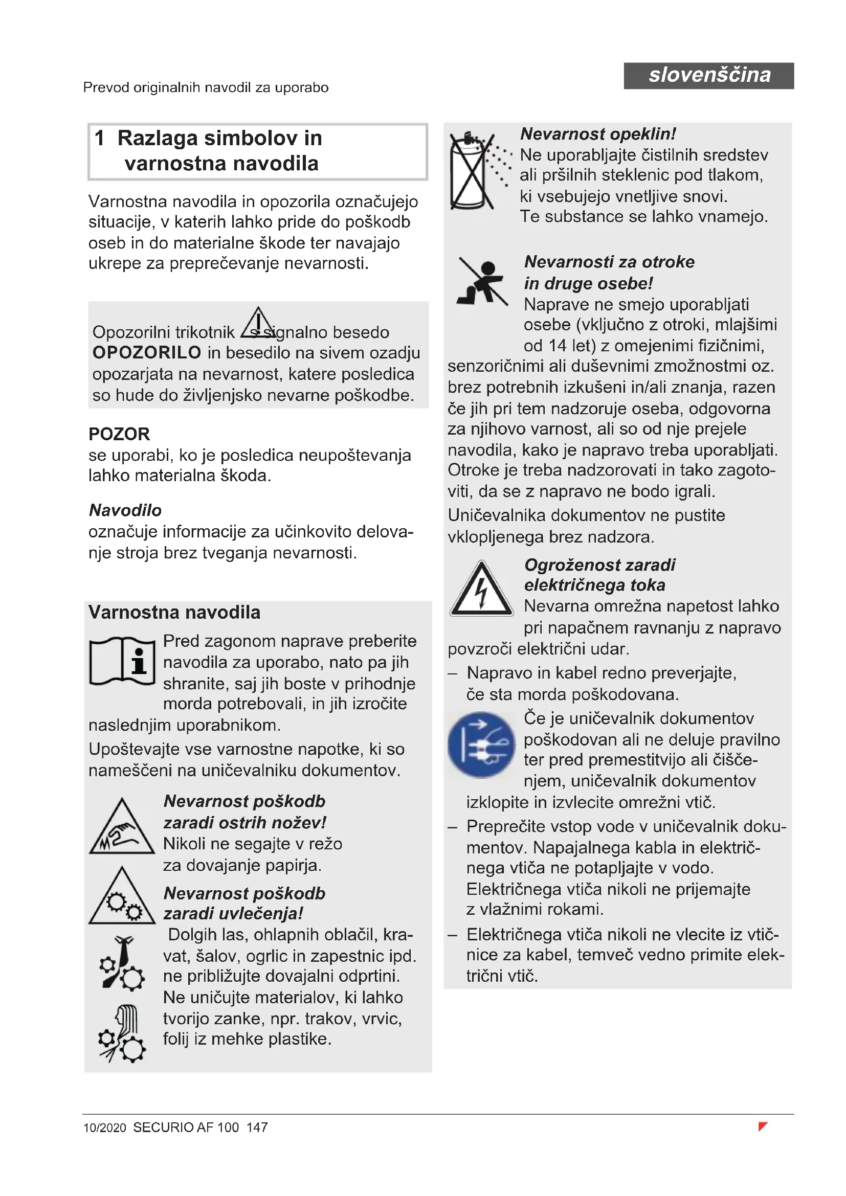 6–7 5–6 Вес 7,6 кг Ширина приемного отверстия 225 мм Скорость резки 45 мм/с Подключение к сети 220–240 В / 50/60 Гц 110–130 В / 50/60 Гц Мощность при макс. количестве листов 185 Вт (EU) / 160 Вт (US) Энергопотребление в режиме ожидания < 2 ватт-час Продолжительность работы, макс. количество листов макс. 15 мин Продолжительность работы, отдельный лист макс. 20 мин Условия окружающей среды во время работы машины: температура относительная влажность высота над уровнем моря От –10 до +25 °C Макс. 90 %, без конденсации Макс. 2000 м Размеры Ш х Г х В (мм) 375 x 260 x 620 Объем резервуара для разрезанного материала 25 л Уровень звукового давления (холостой ход/полная нагрузка) 55-60 dB / 65 -70 dB Уровень звуковой мощности с оценкой А (звуковое давление на холостом ходу) 71 dB10/2020 SECURIO AF 100 147 slovenščina Prevod originalnih navodil za uporabo 1 Razlaga simbolov in varnostna navodila Varnostna navodila in opozorila označujejo situacije, v katerih lahko pride do poškodb oseb in do materialne škode ter navajajo ukrepe za preprečevanje nevarnosti. Navodilo označuje informacije za učinkovito delova- nje stroja brez tveganja nevarnosti. Opozorilni trikotnik s signalno besedo OPOZORILO in besedilo na sivem ozadju opozarjata na nevarnost, katere posledica so hude do življenjsko nevarne poškodbe. POZOR se uporabi, ko je posledica neupoštevanja lahko materialna škoda. Varnostna navodila Pred zagonom naprave preberite navodila za uporabo, nato pa jih shranite, saj jih boste v prihodnje morda potrebovali, in jih izročite naslednjim uporabnikom. Upoštevajte vse varnostne napotke, ki so nameščeni na uničevalniku dokumentov. Nevarnost poškodb zaradi ostrih nožev! Nikoli ne segajte v režo za dovajanje papirja. Nevarnost poškodb zaradi uvlečenja! Dolgih las, ohlapnih oblačil, kra- vat, šalov, ogrlic in zapestnic ipd. ne približujte dovajalni odprtini. Ne uničujte materialov, ki lahko tvorijo zanke, npr. trakov, vrvic, folij iz mehke plastike. Nevarnost opeklin! Ne uporabljajte čistilnih sredstev ali pršilnih steklenic pod tlakom, ki vsebujejo vnetljive snovi. Te substance se lahko vnamejo. Nevarnosti za otroke in druge osebe! Naprave ne smejo uporabljati osebe (vključno z otroki, mlajšimi od 14 let) z omejenimi fi zičnimi, senzoričnimi ali duševnimi zmožnostmi oz. brez potrebnih izkušeni in/ali znanja, razen če jih pri tem nadzoruje oseba, odgovorna za njihovo varnost, ali so od nje prejele navodila, kako je napravo treba uporabljati. Otroke je treba nadzorovati in tako zagoto- viti, da se z napravo ne bodo igrali. Uničevalnika dokumentov ne pustite vklopljenega brez nadzora. Ogroženost zaradi električnega toka Nevarna omrežna napetost lahko pri napačnem ravnanju z napravo povzroči električni udar. – Napravo in kabel redno preverjajte, če sta morda poškodovana. Če je uničevalnik dokumentov poškodovan ali ne deluje pravilno ter pred premestitvijo ali čišče- njem, uničevalnik dokumentov izklopite in izvlecite omrežni vtič. – Preprečite vstop vode v uničevalnik doku- mentov. Napajalnega kabla in električ- nega vtiča ne potapljajte v vodo. Električnega vtiča nikoli ne prijemajte z vlažnimi rokami. – Električnega vtiča nikoli ne vlecite iz vtič- nice za kabel, temveč vedno primite elek- trični vtič.148 SECURIO AF 100 10/2020 slovenščina 3 Pregled