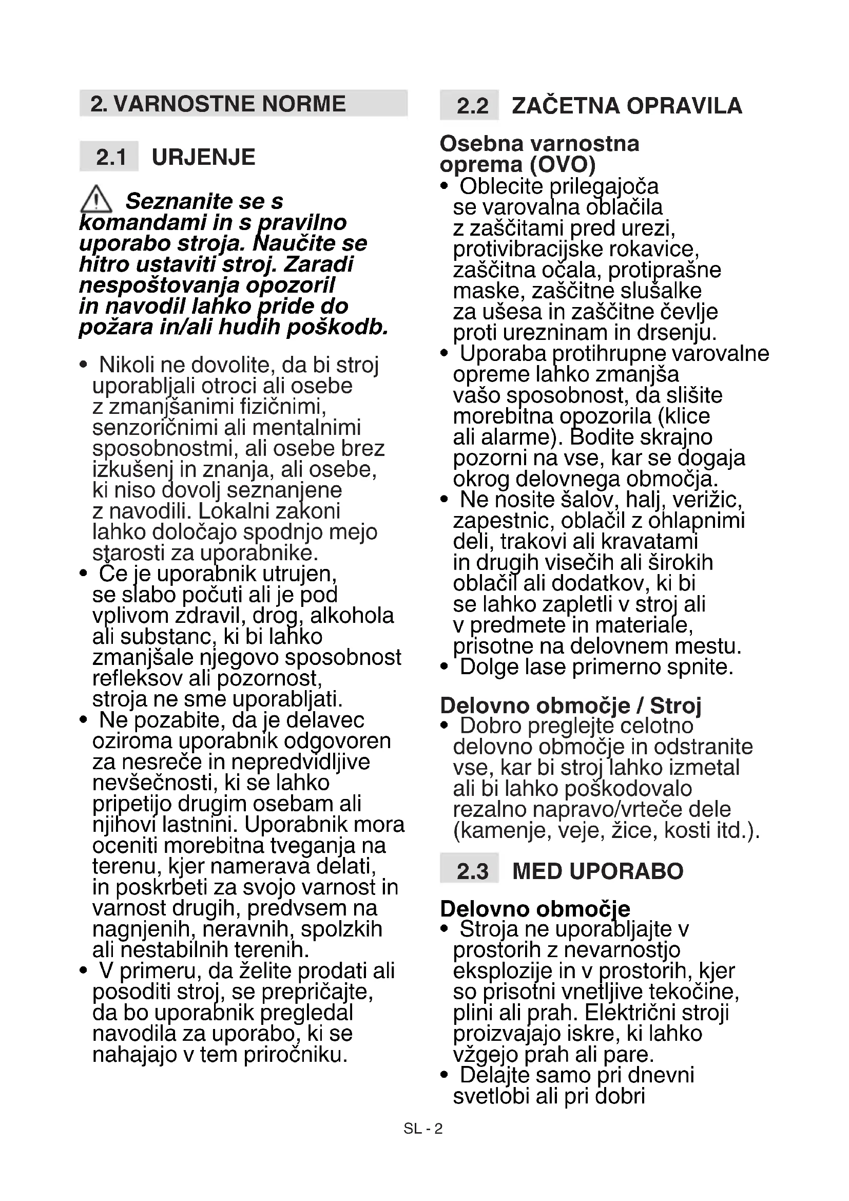- Stroja ne smejo uporabljati osebe, ki ga niso sposobne trdno držati z obema rokama in/ali niso sposobne ostati trdno v ravnotežju med delom.