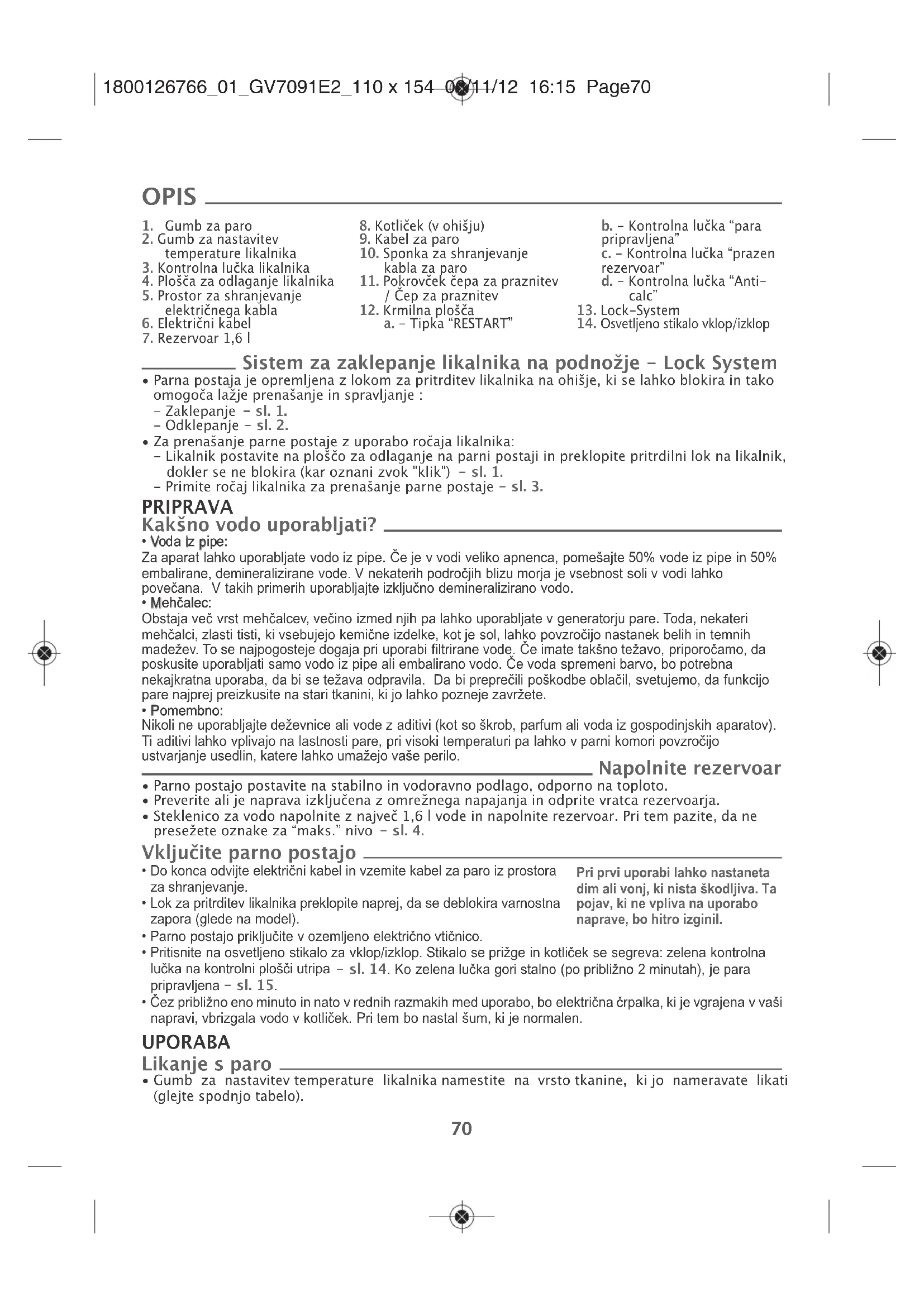 1800126766_01_GV7091E2_110 x 154 06/11/12 16:15 Page7273 Če ni mogoče ugotoviti razloga za težavo, se obrnite na pooblaščen poprodajni servisni center. Težave Možni vzroki Rešitve Parna postaja se ne prižge ali pa se ne prižge kon- trolna lučka likalnika. Naprava ni pod napetostjo. Preverite, ali je aparat vkljuãen v vtiãnico v obratovalnem stanju in ali je pod napetostjo (osvetljeno stikalo za vklop/izklop se priÏge). Voda teče skozi luknje na likalni plošči. Paro uporabljate, ko likalnik še ni dovolj segret. Voda se je kondenzirala v ceveh, ker paro uporabljate prvič ali je že nekaj časa niste uporabljali. Preverite nastavitev termostata. Počakajte, da ugasne kontrolna lučka na likalniku, preden vključite gumb za paro. Pritiskajte na gumb za paro izven likalne deske, dokler likalnik ne začne oddajati pare. Na perilu so opazni sledovi vode. Prevleka likalne deske je prepojena z vodo, ker ni prilagojena moči parne pos- taje. Uporabljajte ustrezno prilagojeno likalno desko (rešetkasta plošča, ki preprečuje kondenzacijo). Iz lukenj likalne plošče teče bela usedlina. S kotlička odpada vodni kamen, ker ga ne izpirate dovolj pogosto. Izperite kotliček. (glejte § “Izpiranje kotlička”) Iz lukenj likalne plošče teče rjava usedlina, ki povzroča madeže na perilu. V vodi za likanje uporabljate kemična sredstva za odstranjevanje vodnega kamna ali dodatke. Izpiranje kotlička (glejte § za odstranje- vanje kamna iz vaše centrale). Likalna plošča je umazana ali rjava in lahko pusti madeže na perilu. Uporabljate previsoko temperaturo. Perilo ni dobro izprano ali pa ste likali novo oblačilo, še preden ste ga oprali. Uporabljate škrob. Glejte naše nasvete v zvezi z nastavitvijo temperature. Poskrbite za dobro izpiranje perila, da se odstranijo morebitne obloge mila ali kemičnih sredstev na novih oblačilih. Škrob vedno škropite na nasprotno stran od tiste, ki jo likate. Pare je premalo ali je sploh ni. Rezervoar je prazen (prižgana je rdeča kontrolna lučka). Temperatura likalne plošče je nastavl- jena na maksimum. Napolnite rezervoar in pritiskajte na tipko "RESTART", dokler lučka ne ugasne. Parna postaja deluje normalno, vendar je zelo vroča para suha in je zato manj vidna. Okrog čepa uhaja para. Zbiralnik je slabo privit. Spoj zbiralnika je poškodovan. Naprava je pomanjkljiva. Ponovno privijte zbiralnik. Obrnite se na pooblaščen servisni center. Parne postaje ne uporabljajte več in se obrnite na pooblaščen servisni center. Rdeča lučka „prazen rezer- voar za vodo” utripa. Niste pritisnili na tipko “RESTART” za ponoven zagon. Za zagon držite pritisnjen gumb „RE- START”, ki se nahaja na komandnem gumbu, vse dokler lučka ne preneha sve- titi. Para ali voda uhajata izpod naprave. Naprava je pomanjkljiva. Parne postaje ne uporabljajte več in se obrnite na pooblaščen servisni center. Lučka „proti vodnemu kamnu” utripa. Niste pritisnili na tipko “RESTART” za ponoven zagon. Za zagon držite pritisnjen gumb „RE- START”, ki se nahaja na komandnem gumbu, vse dokler lučka ne preneha sve- titi. IMATE TEŽAVE S PARNO POSTAJO?