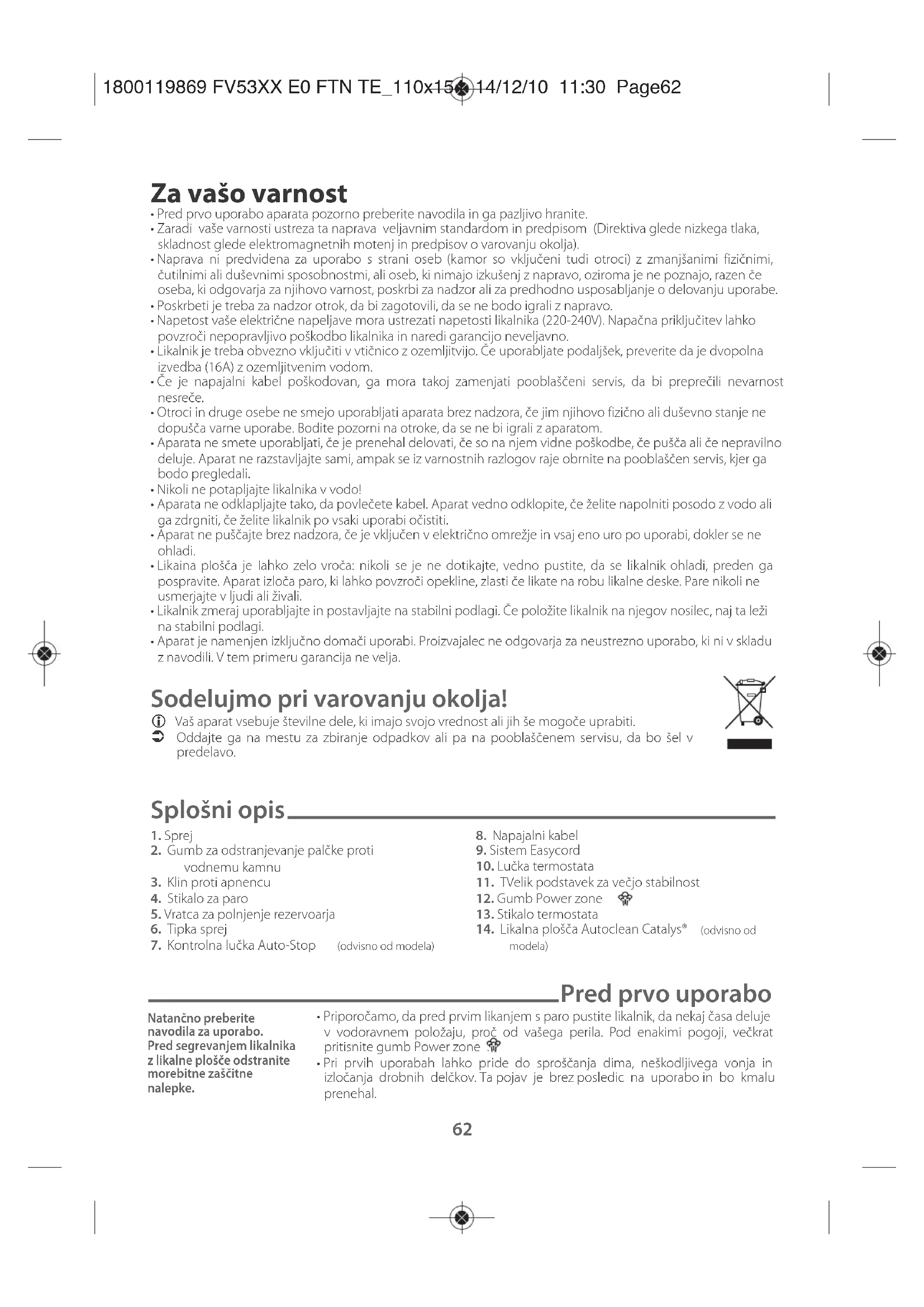 - Pri prvih uporabah lahko pride do sproščanja dima, neškodljivega vonja in izločanja drobnih delčkov. Ta pojav je brez posledic na uporabo in bo kmalu prenehal. Natančno preberite navodila za uporabo. Pred segrevanjem likalnika z likalne plošče odstranite morebitne zaščitne nalepke. 1800119869 FV53XX E0 FTN TE_110x154 14/12/10 11:30 Page62EN