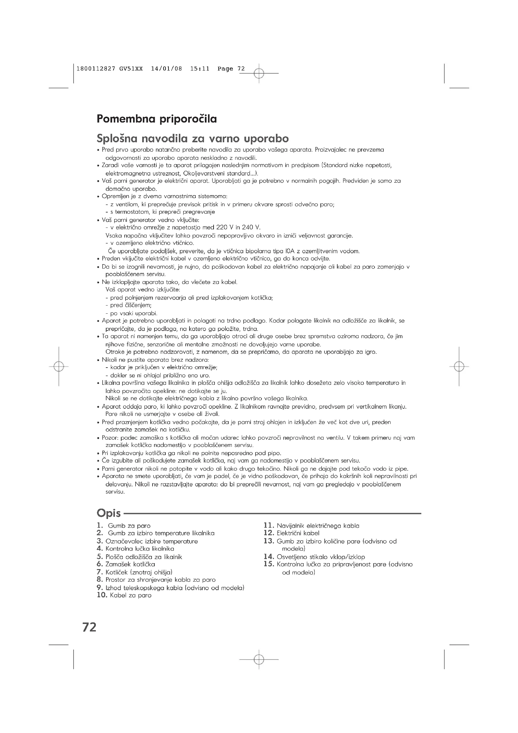 - Pozor: Za podaljšanje učinkovitosti vašega kotlička in odlaganje kamna, morate obveznoizplakniti vaš kotliček po vsaki šesti uporabi (H) (približno enkrat na mesec).• Preverite, da je parni generator ohlajen in izključen več kot dve uri.• Uporabite vrč za vodo in kotliček napolnite največ s 3/4 l vode.• Nekaj trenutkov pretresajte ohišje, nato ga popolnoma izpraznite nad pomivalnimkoritom (I).• Za čim boljši rezultat vam predlagamo, da postopek še enkrat ponovite.Če vsebuje vaša vodaveliko apnenca,postopek pogostejeponovite. Predvsem neuporabljajte sredstev zaodstranjevanje vodnegakamna pri izplakovanjukotlička: lahko gapoškodujejo. SLO Sodelujmo pri varovanju okolja ! Vaš aparat vsebuje številne dele, ki imajo svojo vrednost ali jih še mogoče uprabiti. Oddajte ga na mestu za zbiranje odpadkov ali pa na pooblaščenem servisu, da bo šel v predelavo. Težave Možni vzroki Rešitve Voda teče iz por na likalni površini. Kotliček je preveč napolnjen.Vaš termostat ni pravilno nastavljen-temperatura je prenizka.Uporabljate paro, medtem ko vaš likalnik nidovolj vroč.Voda se je nabrala v ceveh, ker prvičuporabljate paro ali je niste uporabili ženekaj časa.Ne napolnite kotlička čisto do vrha.Obrnite se na pooblaščeni servis.Preverite nastavitev termostata in količinepare (odvisno od modela).Pritisnite gumb za vključitev pare stran odvaše likalne mize, tako dolgo dokler likalnikspušča paro.Bel izcedek prihaja ven skozi pore likalnepovršine.V vašem kotličku se nabira vodni kamen,ker ni redno izplaknjen.Izplaknite kotliček po vsaki deseti uporabi(glej § izplakovanje kotlička) Če je vašavoda trša, ponovite postopek pogosteje.Rjav izcedek prihaja ven iz por likalnepovršine in umažejo perilo.Uporabljate kemična sredstva zaodstranjevanje vodnega kamna ali pavodo z dodatki.Nikoli ne uporabite nobenega sredstva zakotliček ( glej § katero vodo najuporabimo?).Likalna površina je umazana in lahkoumaže perilo.Uporabili ste previsoko temperaturo.Vaše perilo ni bilo dovolj splahnjeno ali paste likali novo oblačilo ne da bi oprali.Uporabljate škrob.Pomagajte si z našimi nasveti za izbirotemperature.Prepričajte se, ali je perilo dovoljsplahnjeno, ker so lahko na oblačilihostanki pralnega praška, na novi oblačilihpa tudi kemične snovi.Škrob posipajte vedno na hrbtno stran,nasprotno od tiste, ki jo likate.Pare je malo ali je sploh ni. Kotliček je prazen.Kotliček še ni pripravljen.Napolnite kotliček.Po vklopu počakajte osem minut oziroma, dase prižge kontrolna lučka za pripravljenostpare (odvisno od modela).Para izhaja iz zamaška. Zamašek ni dobro privit.Spoj zamaška je poškodovan.Aparat je v okvari.Privijte zamašek.Ne uporabljajte parnega generatorja in seobrnite na pooblaščeni servis.Ne uporabljajte parnega generatorja in seobrnite na pooblaščeni servis.Para ali voda uhajata iz aparata. Aparat je v okvari. Ne uporabljajte parnega generatorja in seobrnite na pooblaščeni servis. 1800112827 GV51XX 14/01/08 15:11 Page 75Važne preporuke Sigurnosni savjeti