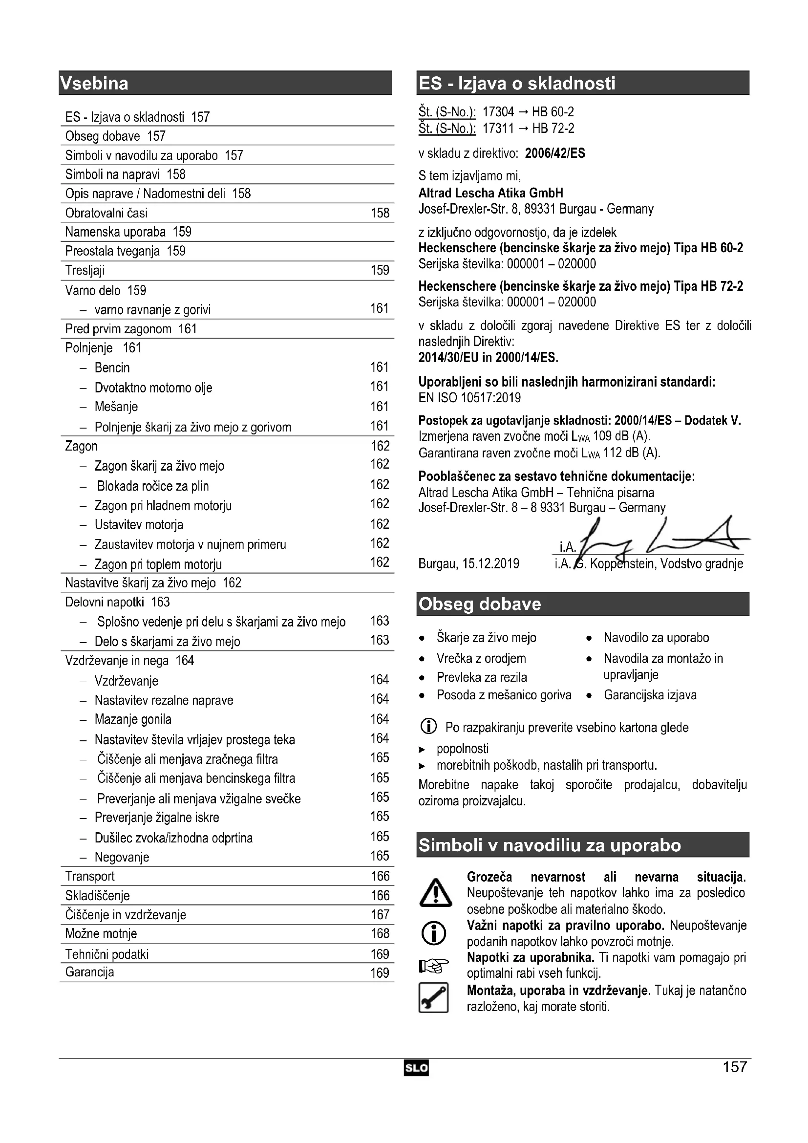 ES - Izjava o skladnosti Št. (S-No.): 17304 HB 60-2 Št. (S-No.): 17311 HB 72-2 v skladu z direktivo: 2006/42/ES S tem izjavljamo mi, Altrad Lescha Atika GmbH Josef-Drexler-Str. 8, 89331 Burgau - Germany z izključno odgovornostjo, da je izdelek Heckenschere (bencinske škarje za živo mejo) Tipa HB 60-2 Serijska številka: 000001 – 020000 Heckenschere (bencinske škarje za živo mejo) Tipa HB 72-2 Serijska številka: 000001 – 020000 v skladu z določili zgoraj navedene Direktive ES ter z določili naslednjih Direktiv: 2014/30/EU in 2000/14/ES. Uporabljeni so bili naslednjih harmonizirani standardi: EN ISO 10517:2019 Postopek za ugotavljanje skladnosti: 2000/14/ES – Dodatek V. Izmerjena raven zvočne moči L