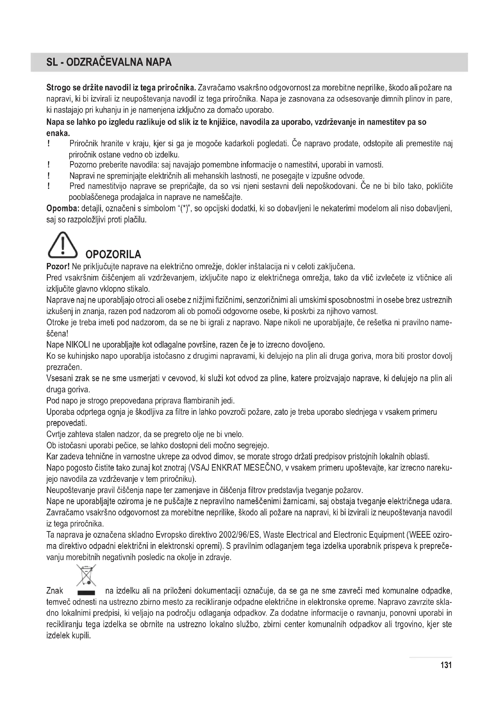 Strogo se držite navodil iz tega priročnika. Zavračamo vsakršno odgovornost za morebitne neprilike, škodo ali požare na napravi, ki bi izvirali iz neupoštevanja navodil iz tega priročnika. Napa je zasnovana za odsesovanje dimnih plinov in pare, ki nastajajo pri kuhanju in je namenjena izključno za domačo uporabo. Napa se lahko po izgledu razlikuje od slik iz te knjižice, navodila za uporabo, vzdrževanje in namestitev pa so enaka. ! Priročnik hranite v kraju, kjer si ga je mogoče kadarkoli pogledati. Če napravo prodate, odstopite ali premestite naj priročnik ostane vedno ob izdelku. ! Pozorno preberite navodila: saj navajajo pomembne informacije o namestitvi, uporabi in varnosti. ! Napravi ne spreminjajte električnih ali mehanskih lastnosti, ne posegajte v izpušne odvode. ! Pred namestitvijo naprave se prepričajte, da so vsi njeni sestavni deli nepoškodovani. Če ne bi bilo tako, pokličite pooblaščenega prodajalca in naprave ne nameščajte. Opomba: detajli, označeni s simbolom “(*)”, so opcijski dodatki, ki so dobavljeni le nekaterimi modelom ali niso dobavljeni, saj so razpoložljivi proti plačilu. OPOZORILA Pozor! Ne priključujte naprave na električno omrežje, dokler inštalacija ni v celoti zaključena. Pred vsakršnim čiščenjem ali vzdrževanjem, izključite napo iz električnega omrežja, tako da vtič izvlečete iz vtičnice ali izključite glavno vklopno stikalo. Naprave naj ne uporabljajo otroci ali osebe z nižjimi zičnimi, senzoričnimi ali umskimi sposobnostmi in osebe brez ustreznih izkušenj in znanja, razen pod nadzorom ali ob pomoči odgovorne osebe, ki poskrbi za njihovo varnost. Otroke je treba imeti pod nadzorom, da se ne bi igrali z napravo. Nape nikoli ne uporabljajte, če rešetka ni pravilno name- ščena! Nape NIKOLI ne uporabljajte kot odlagalne površine, razen če je to izrecno dovoljeno. Ko se kuhinjsko napo uporablja istočasno z drugimi napravami, ki delujejo na plin ali druga goriva, mora biti prostor dovolj prezračen. Vsesani zrak se ne sme usmerjati v cevovod, ki služi kot odvod za pline, katere proizvajajo naprave, ki delujejo na plin ali druga goriva. Pod napo je strogo prepovedana priprava ambiranih jedi. Uporaba odprtega ognja je škodljiva za ltre in lahko povzroči požare, zato je treba uporabo slednjega v vsakem primeru prepovedati. Cvrtje zahteva stalen nadzor, da se pregreto olje ne bi vnelo. Ob istočasni uporabi pečice, se lahko dostopni deli močno segrejejo. Kar zadeva tehnične in varnostne ukrepe za odvod dimov, se morate strogo držati predpisov pristojnih lokalnih oblasti. Napo pogosto čistite tako zunaj kot znotraj (VSAJ ENKRAT MESEČNO, v vsakem primeru upoštevajte, kar izrecno nareku- jejo navodila za vzdrževanje v tem priročniku). Neupoštevanje pravil čiščenja nape ter zamenjave in čiščenja ltrov predstavlja tveganje požarov. Nape ne uporabljajte oziroma je ne puščajte z nepravilno nameščenimi žarnicami, saj obstaja tveganje električnega udara. Zavračamo vsakršno odgovornost za morebitne neprilike, škodo ali požare na napravi, ki bi izvirali iz neupoštevanja navodil iz tega priročnika. Ta naprava je označena skladno Evropsko direktivo 2002/96/ES, Waste Electrical and Electronic Equipment (WEEE oziro- ma direktivo odpadni električni in elektronski opremi). S pravilnim odlaganjem tega izdelka uporabnik prispeva k prepreče- vanju morebitnih negativnih posledic na okolje in zdravje. Z n a k na izdelku ali na priloženi dokumentaciji označuje, da se ga ne sme zavreči med komunalne odpadke, temveč odnesti na ustrezno zbirno mesto za recikliranje odpadne električne in elektronske opreme. Napravo zavrzite skla- dno lokalnimi predpisi, ki veljajo na področju odlaganja odpadkov. Za dodatne informacije o ravnanju, ponovni uporabi in recikliranju tega izdelka se obrnite na ustrezno lokalno službo, zbirni center komunalnih odpadkov ali trgovino, kjer ste izdelek kupili.132 Aparat je bil zasnovan, testiran in izdelan v skladu z: