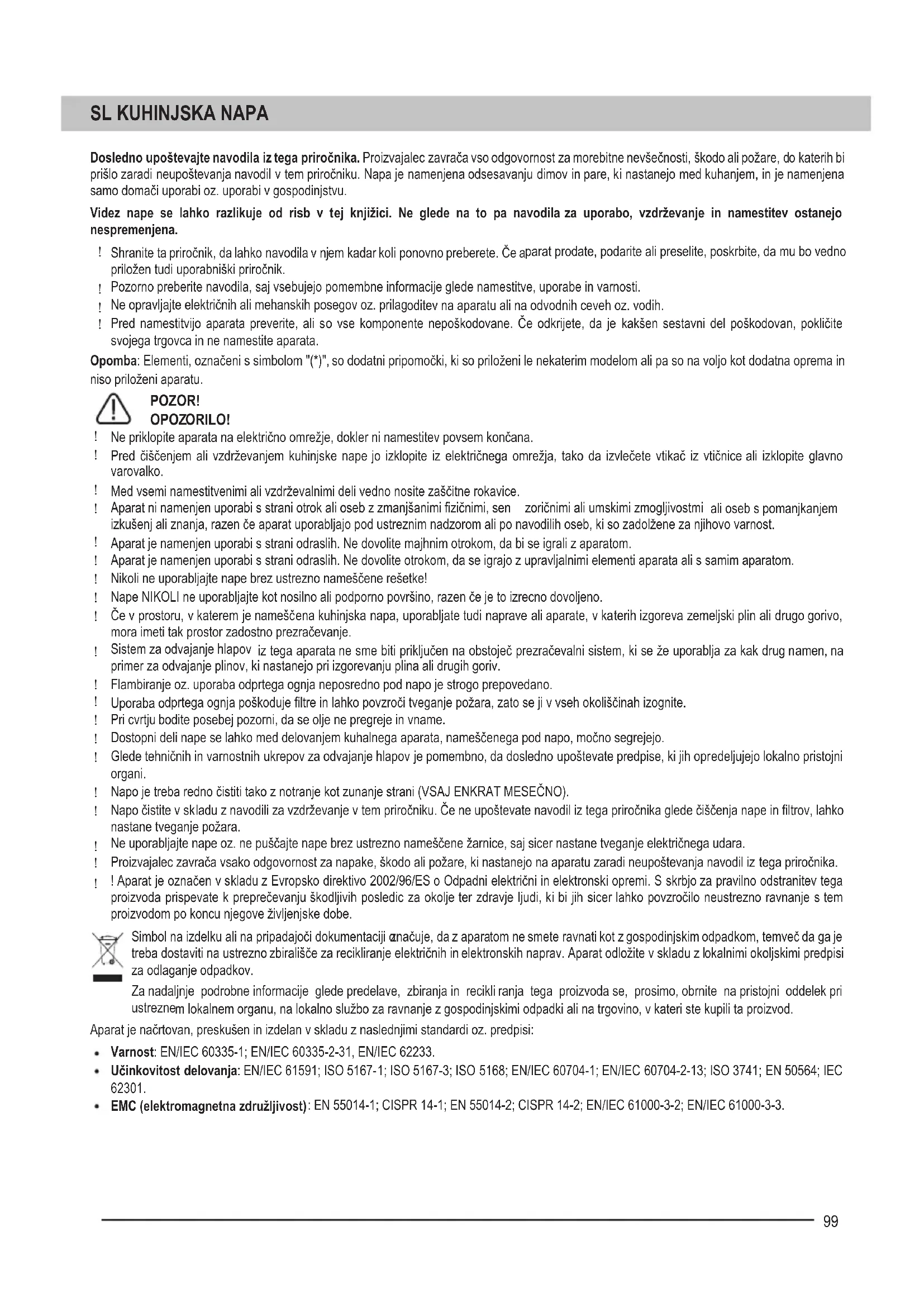 Dosledno upoštevajte navodila iz tega priročnika. Proizvajalec zavrača vso odgovornost za morebitne nevšečnosti, škodo ali požare, do katerih bi prišlo zaradi neupoštevanja navodil v tem priročniku. Napa je namenjena odsesavanju dimov in pare, ki nastanejo med kuhanjem, in je namenjena samo domači uporabi oz. uporabi v gospodinjstvu. Videz nape se lahko razlikuje od risb v tej knjižici. Ne glede na to pa navodila za uporabo, vzdrževanje in namestitev ostanejo nespremenjena. Shranite ta priročnik, da lahko navodila v njem kadar koli ponovno preberete. Če a parat prodate, podarite ali preselite, poskrbite, da mu bo vedno priložen tudi uporabniški priročnik. Pozorno preberite navodila, saj vsebujejo pomembne informacije glede namestitve, uporabe in varnosti. Ne opravljajte električnih ali mehanskih posegov oz. prilag oditev na aparatu ali na odvodnih ceveh oz. vodih. Pred namestitvijo aparata preverite, ali so vse komponente nepoškodovane. Če odkrijete, da je kakšen sestavni del poškodovan, pokličite svojega trgovca in ne namestite aparata. Opomba: Elementi, označeni s simbolom "(*)", so dodatni pripomočki, ki so priloženi le nekaterim modelom ali pa so na voljo kot dodatna oprema in niso priloženi aparatu. POZOR! OPOZ ORILO! Ne priklopite aparata na električno omrežje, dokler ni namestitev povsem končana. Pred čiščenjem ali vzdrževanjem kuhinjske nape jo izklopite iz električnega omrežja, tako da izvlečete vtikač iz vtičnice ali izklopite glavno varovalko. Med vsemi namestitvenimi ali vzdrževalnimi deli vedno nosite zaščitne rokavice. Aparat ni namenjen uporabi s strani otrok ali oseb z zmanjšanimi fizičnimi, sen zoričnimi ali umskimi zmogljivostmi ali oseb s pomanjkanjem izkušenj ali znanja, razen če aparat uporabljajo pod ustreznim nadzorom ali po navodilih oseb, ki so zadolžene za njihovo varnost. Aparat je namenjen uporabi s strani odraslih. Ne dovolite majhnim otrokom, da bi se igrali z aparatom. Aparat je namenjen uporabi s strani odraslih. Ne dovolite otrokom, da se igrajo z upravljalnimi elementi a parata ali s samim aparatom. Nikoli ne uporabljajte nape brez ustrezno nameščene rešetke! Nape NIKOLI ne uporabljajte kot nosilno ali podporno površino, razen če je to izrecno dovoljeno. Če v prostoru, v katerem je nameščena kuhinjska napa, uporabljate tudi naprave ali aparate, v katerih izgoreva zemeljski plin ali drugo gorivo, mora imeti tak prostor zadostno prezračevanje. Sistem za odvajanje hlapov iz tega aparata ne sme biti priključen na obstoječ prezračevalni sistem, ki se že uporablja za kak drug namen, na primer za odvajanje plinov, ki nastanejo pri izgorevanju plina ali drugih goriv. Flambiranje oz. uporaba odprtega ognja neposredno pod napo je strogo prepovedano. Uporaba o dprtega ognja poškoduje filtre in lahko povzroči tveganje požara, zato se ji v vseh okoliščinah izognite. Pri cvrtju bodite posebej pozorni, da se olje ne pregreje in vname. Dostopni deli nape se lahko med delovanjem kuhalnega aparata, nameščenega pod napo, močno segrejejo. Glede tehničnih in varnostnih ukrepov za odvajanje hlapov je pomembno, da dosledno upoštevate predpise, ki jih opredeljujejo lokalno pristojni organi. Napo je treba redno čistiti tako z notranje kot zunanje strani (VSAJ ENKRAT MESEČNO). Napo čistite v sk ladu z navodili za vzdrževanje v tem priro čniku. Če ne upoštevate navodil iz tega priročnika glede čiščenja nape in filtrov, lahko nastane tveganje požara. Ne uporabljajte nape oz. ne puščajte nape brez ustrezno nameščene žarnice, saj sicer nastane tveganje električnega udara. Proizvajalec zavrača vsako odgovornost za napake, škodo ali požare, ki nastanejo na aparatu zaradi neupoštevanja navodil iz tega priročnika. ! Aparat je označen v skladu z Evropsko direktivo 2002/96/ES o Odpadni električni in elektronski opremi. S skrbjo za pravilno odstranitev tega proizvoda prispevate k preprečevanju škodljivih posledic za okolje ter zdravje ljudi, ki bi jih sicer lahko povzročilo neustrezno ravnanje s tem proizvodom po koncu njegove življenjske dobe. Simbol na izdelku ali na pripadajoči dokumentaciji o značuje, da z aparatom ne smete ravnati kot z gospodinjskim odpadkom, temveč da ga je treba dostaviti na ustrezno zbirališče za recikliranje električnih in elektronskih naprav. Aparat odložite v skladu z lokalnimi okoljskimi predpisi za odlaganje odpadkov. Za nadaljnje podrobne informacije glede predelave, zbiranja in recikli ranja tega proizvoda se, prosimo, obrnite na pristojni oddelek pri ustrezne m lokalnem organu, na lokalno službo za ravnanje z gospodinjskimi odpadki ali na trgovino, v kateri ste kupili ta proizvod. Aparat je načrtovan, preskušen in izdelan v skladu z naslednjimi standardi oz. predpisi: Varnost: EN/IEC 60335-1; EN/IEC 60335-2-31, EN/IEC 62233. Učinkovitost delovanja: EN/IEC 61591; ISO 5167-1; ISO 5167-3; ISO 5168; EN/IEC 60704-1; EN/IEC 60704-2-13; ISO 3741; EN 50564; IEC