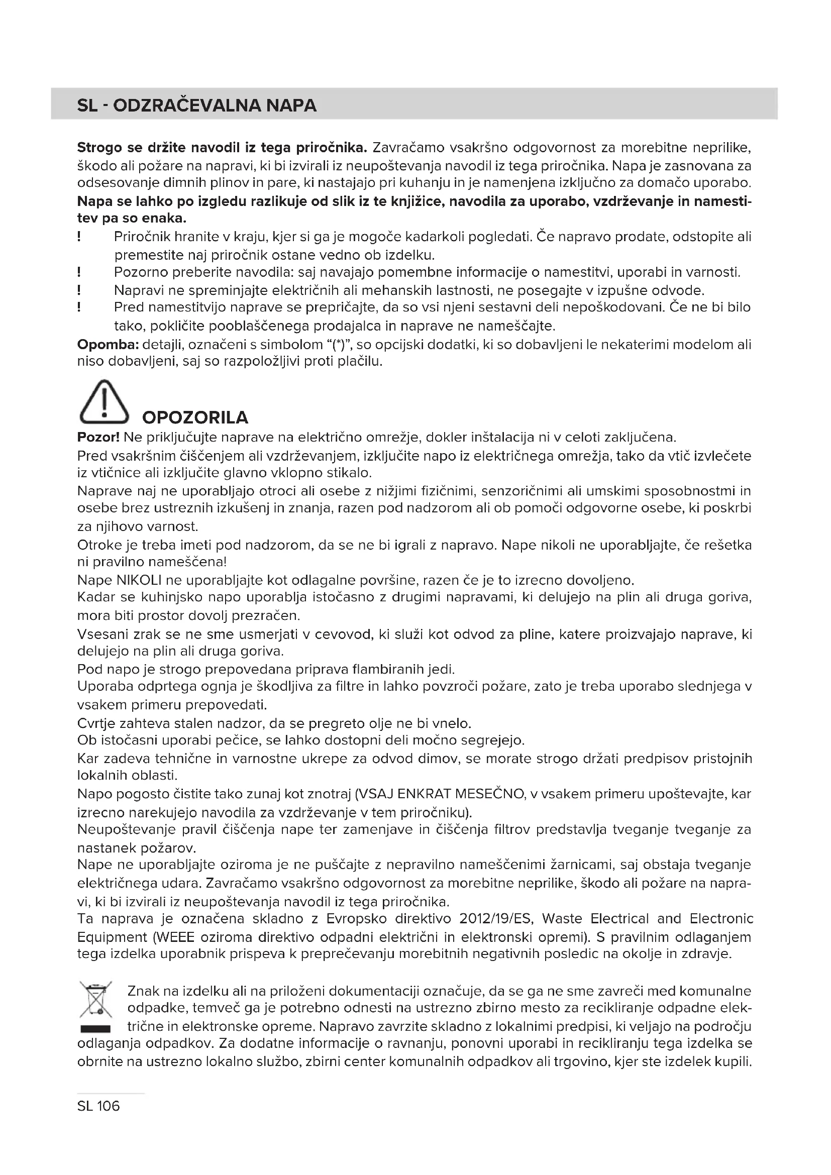 Strogo se držite navodil iz tega priročnika. Zavračamo vsakršno odgovornost za morebitne neprilike, škodo ali požare na napravi, ki bi izvirali iz neupoštevanja navodil iz tega priročnika. Napa je zasnovana za odsesovanje dimnih plinov in pare, ki nastajajo pri kuhanju in je namenjena izključno za domačo uporabo. Napa se lahko po izgledu razlikuje od slik iz te knjižice, navodila za uporabo, vzdrževanje in namesti- tev pa so enaka. ! Priročnik hranite v kraju, kjer si ga je mogoče kadarkoli pogledati. Če napravo prodate, odstopite ali premestite naj priročnik ostane vedno ob izdelku. ! Pozorno preberite navodila: saj navajajo pomembne informacije o namestitvi, uporabi in varnosti. ! Napravi ne spreminjajte električnih ali mehanskih lastnosti, ne posegajte v izpušne odvode. ! Pred namestitvijo naprave se prepričajte, da so vsi njeni sestavni deli nepoškodovani. Če ne bi bilo tako, pokličite pooblaščenega prodajalca in naprave ne nameščajte. Opomba: detajli, označeni s simbolom “(*)”, so opcijski dodatki, ki so dobavljeni le nekaterimi modelom ali niso dobavljeni, saj so razpoložljivi proti plačilu. OPOZORILA Pozor! Ne priključujte naprave na električno omrežje, dokler inštalacija ni v celoti zaključena. Pred vsakršnim čiščenjem ali vzdrževanjem, izključite napo iz električnega omrežja, tako da vtič izvlečete iz vtičnice ali izključite glavno vklopno stikalo. Naprave naj ne uporabljajo otroci ali osebe z nižjimi fizičnimi, senzoričnimi ali umskimi sposobnostmi in osebe brez ustreznih izkušenj in znanja, razen pod nadzorom ali ob pomoči odgovorne osebe, ki poskrbi za njihovo varnost. Otroke je treba imeti pod nadzorom, da se ne bi igrali z napravo. Nape nikoli ne uporabljajte, če rešetka ni pravilno nameščena! Nape NIKOLI ne uporabljajte kot odlagalne površine, razen če je to izrecno dovoljeno. Kadar se kuhinjsko napo uporablja istočasno z drugimi napravami, ki delujejo na plin ali druga goriva, mora biti prostor dovolj prezračen. Vsesani zrak se ne sme usmerjati v cevovod, ki služi kot odvod za pline, katere proizvajajo naprave, ki delujejo na plin ali druga goriva. Pod napo je strogo prepovedana priprava flambiranih jedi. Uporaba odprtega ognja je škodljiva za filtre in lahko povzroči požare, zato je treba uporabo slednjega v vsakem primeru prepovedati. Cvrtje zahteva stalen nadzor, da se pregreto olje ne bi vnelo. Ob istočasni uporabi pečice, se lahko dostopni deli močno segrejejo. Kar zadeva tehnične in varnostne ukrepe za odvod dimov, se morate strogo držati predpisov pristojnih lokalnih oblasti. Napo pogosto čistite tako zunaj kot znotraj (VSAJ ENKRAT MESEČNO, v vsakem primeru upoštevajte, kar izrecno narekujejo navodila za vzdrževanje v tem priročniku). Neupoštevanje pravil čiščenja nape ter zamenjave in čiščenja filtrov predstavlja tveganje tveganje za nastanek požarov. Nape ne uporabljajte oziroma je ne puščajte z nepravilno nameščenimi žarnicami, saj obstaja tveganje električnega udara. Zavračamo vsakršno odgovornost za morebitne neprilike, škodo ali požare na napra- vi, ki bi izvirali iz neupoštevanja navodil iz tega priročnika. Ta naprava je označena skladno z Evropsko direktivo 2012/19/ES, Waste Electrical and Electronic Equipment (WEEE oziroma direktivo odpadni električni in elektronski opremi). S pravilnim odlaganjem tega izdelka uporabnik prispeva k preprečevanju morebitnih negativnih posledic na okolje in zdravje. Znak na izdelku ali na priloženi dokumentaciji označuje, da se ga ne sme zavreči med komunalne odpadke, temveč ga je potrebno odnesti na ustrezno zbirno mesto za recikliranje odpadne elek- trične in elektronske opreme. Napravo zavrzite skladno z lokalnimi predpisi, ki veljajo na področju odlaganja odpadkov. Za dodatne informacije o ravnanju, ponovni uporabi in recikliranju tega izdelka se obrnite na ustrezno lokalno službo, zbirni center komunalnih odpadkov ali trgovino, kjer ste izdelek kupili.SL107 Aparat je bil zasnovan, testiran in izdelan v skladu z: