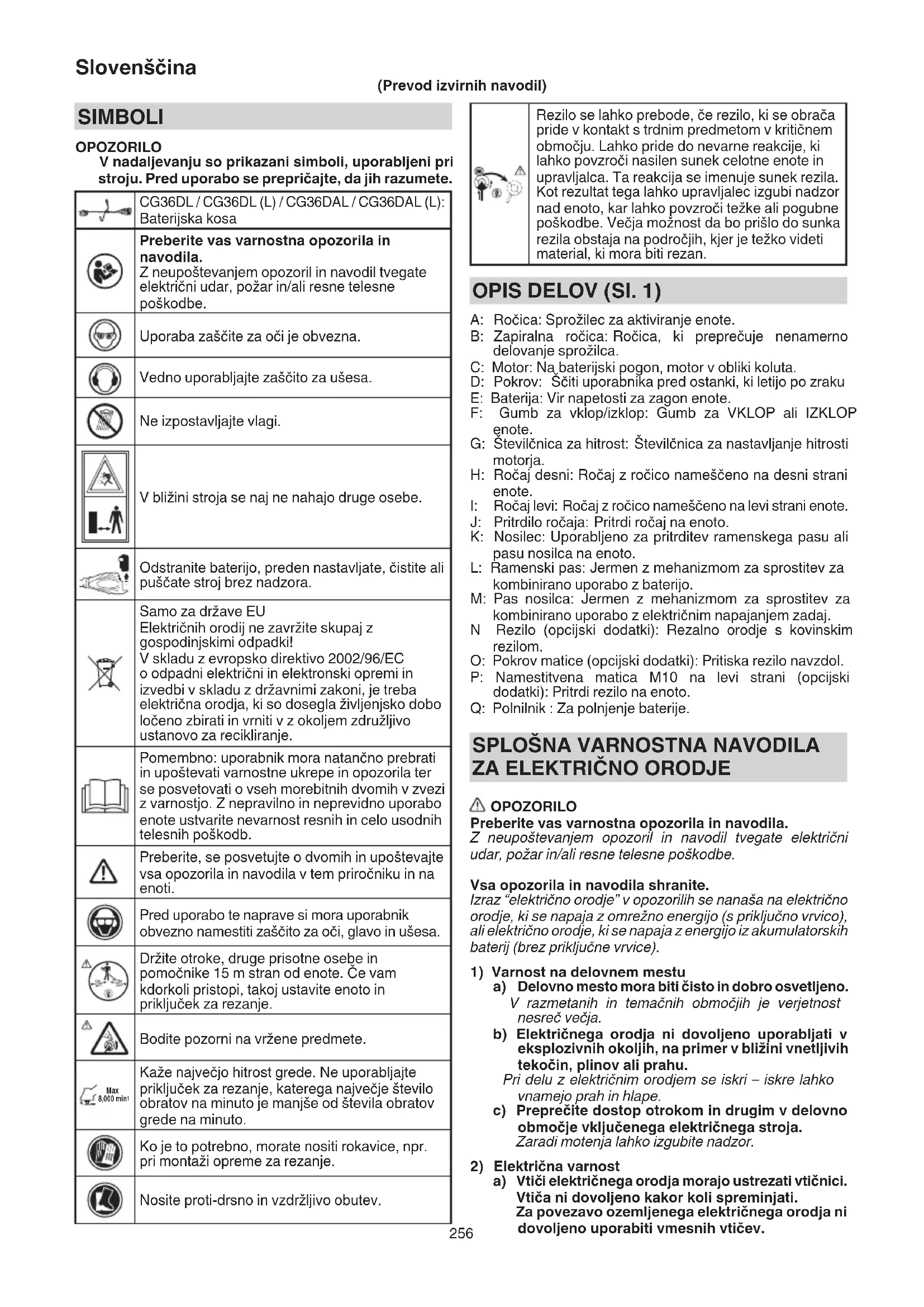 a) Vtiči električnega orodja morajo ustrezati vtičnici. Vtiča ni dovoljeno kakor koli spreminjati. Za povezavo ozemljenega električnega orodja ni dovoljeno uporabiti vmesnih vtičev. SIMBOLI OPOZORILO V nadaljevanju so prikazani simboli, uporabljeni pri stroju. Pred uporabo se prepričajte, da jih razumete. CG36DL / CG36DL (L) / CG36DAL / CG36DAL (L): Baterijska kosa Preberite vas varnostna opozorila in navodila. Z neupoštevanjem opozoril in navodil tvegate električni udar, požar in/ali resne telesne poškodbe. Uporaba zaščite za oči je obvezna. Vedno uporabljajte zaščito za ušesa. Ne izpostavljajte vlagi. V bližini stroja se naj ne nahajo druge osebe. Odstranite baterijo, preden nastavljate, čistite ali puščate stroj brez nadzora. Samo za države EU Električnih orodij ne zavržite skupaj z gospodinjskimi odpadki! V skladu z evropsko direktivo 2002/96/EC o odpadni električni in elektronski opremi in izvedbi v skladu z državnimi zakoni, je treba električna orodja, ki so dosegla življenjsko dobo ločeno zbirati in vrniti v z okoljem združljivo ustanovo za recikliranje. Pomembno: uporabnik mora natančno prebrati in upoštevati varnostne ukrepe in opozorila ter se posvetovati o vseh morebitnih dvomih v zvezi z varnostjo. Z nepravilno in neprevidno uporabo enote ustvarite nevarnost resnih in celo usodnih telesnih poškodb. Preberite, se posvetujte o dvomih in upoštevajte vsa opozorila in navodila v tem priročniku in na enoti. Pred uporabo te naprave si mora uporabnik obvezno namestiti zaščito za oči, glavo in ušesa. Držite otroke, druge prisotne osebe in pomočnike 15 m stran od enote. Če vam kdorkoli pristopi, takoj ustavite enoto in priključek za rezanje. Bodite pozorni na vržene predmete. Max 8,000 min