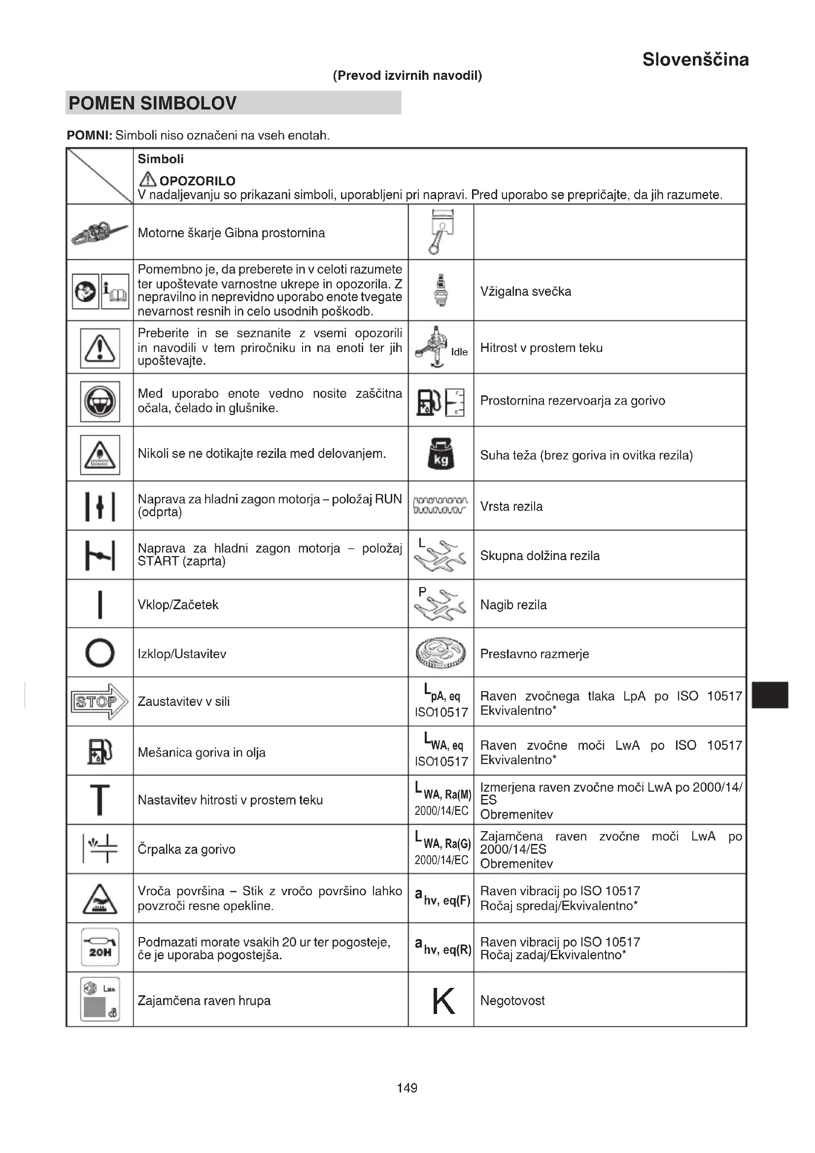 (Prevod izvirnih navodil) POMEN SIMBOLOV POMNI: Simboli niso označeni na vseh enotah. Simboli OPOZORILO V nadaljevanju so prikazani simboli, uporabljeni pri napravi. Pred uporabo se prepričajte, da jih razumete. Motorne škarje Gibna prostornina Pomembno je, da preberete in v celoti razumete ter upoštevate varnostne ukrepe in opozorila. Z nepravilno in neprevidno uporabo enote tvegate nevarnost resnih in celo usodnih poškodb. Vžigalna svečka Preberite in se seznanite z vsemi opozorili in navodili v tem priročniku in na enoti ter jih upoštevajte. Idle Hitrost v prostem teku Med uporabo enote vedno nosite zaščitna očala, čelado in glušnike. Prostornina rezervoarja za gorivo Nikoli se ne dotikajte rezila med delovanjem. Suha teža (brez goriva in ovitka rezila) Naprava za hladni zagon motorja – položaj RUN (odprta) Vrsta rezila Naprava za hladni zagon motorja – položaj START (zaprta)