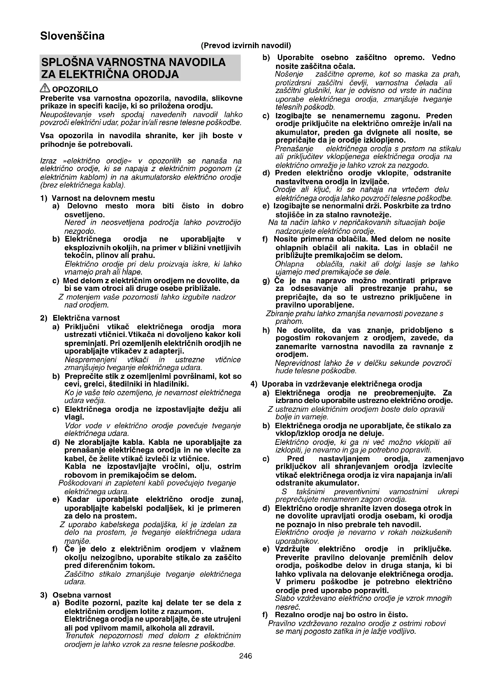 OPOZORILO Preberite vsa varnostna opozorila, navodila, slikovne prikaze in specifi kacije, ki so priložena orodju. Neupoštevanje vseh spodaj navedenih navodil lahko povzroči električni udar, požar in/ali resne telesne poškodbe. Vsa opozorila in navodila shranite, ker jih boste v prihodnje še potrebovali. Izraz »električno orodje« v opozorilih se nanaša na električno orodje, ki se napaja z električnim pogonom (z električnim kablom) in na akumulatorsko električno orodje (brez električnega kabla).