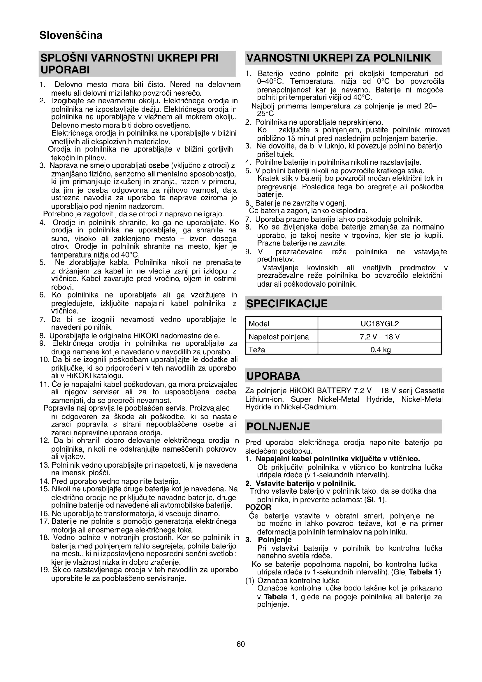 predmetov. Vstavljanje kovinskih ali vnetljivih predmetov v prezračevalne reže polnilnika bo povzročilo električni udar ali poškodovalo polnilnik. SPECIFIKACIJE Model UC18YGL2 Napetost polnjena 7,2 V – 18 V Teža 0,4 kg UPORABA Za polnjenje HiKOKI BATTERY 7,2 V – 18 V serij Cassette Lithium-ion, Super Nickel-Metal Hydride, Nickel-Metal Hydride in Nickel-Cadmium. POLNJENJE Pred uporabo električnega orodja napolnite baterijo po sledečem postopku.