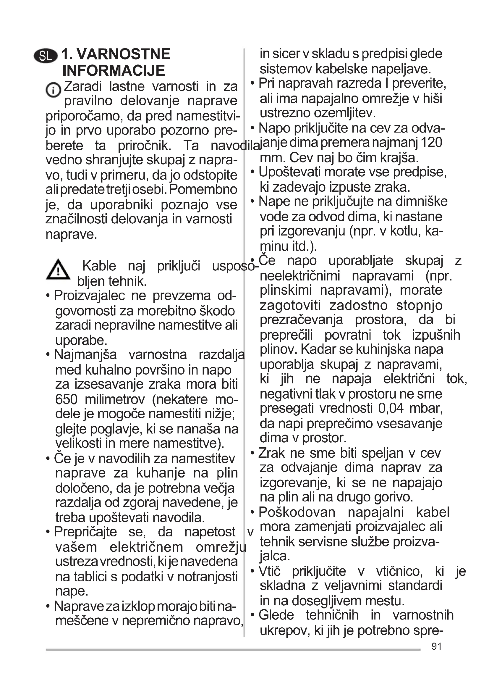 - Če napo uporabljate skupaj z neelektričnimi napravami (npr. plinskimi napravami), morate zagotoviti zadostno stopnjo prezračevanja prostora, da bi preprečili povratni tok izpušnih plinov. Kadar se kuhinjska napa uporablja skupaj z napravami, ki jih ne napaja električni tok, negativni tlak v prostoru ne sme presegati vrednosti 0,04 mbar, danapipreprečimovsesavanje dima v prostor.