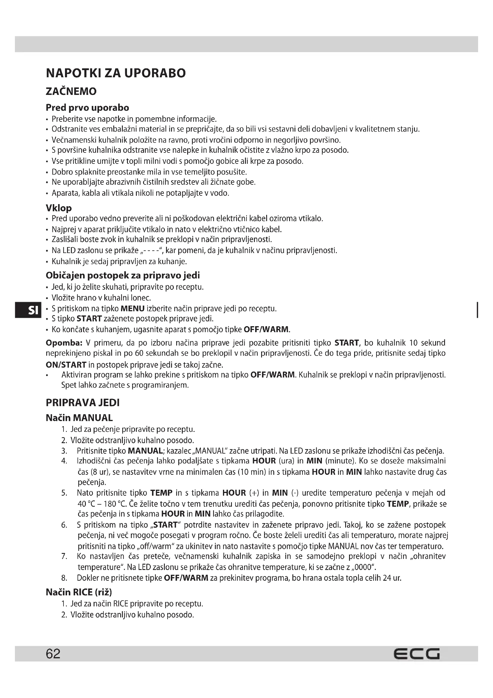 - Aktiviran program se lahko prekine spritiskom na tipko OFF/WARM. Kuhalnik se preklopi vnačin pripravljenosti. Spet lahko začnete sprogramiranjem. PRIPRAVA JEDI Način MANUAL