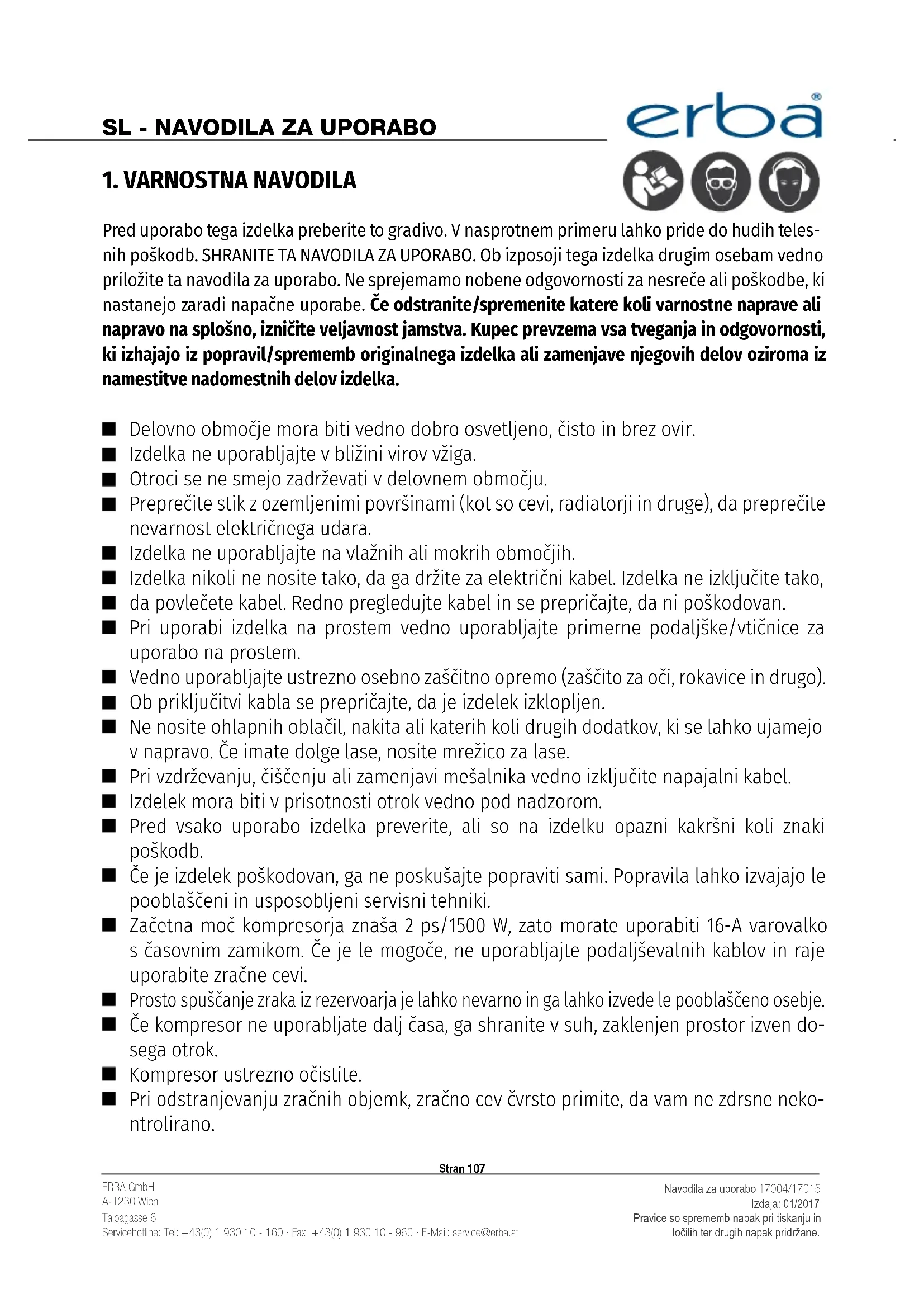Prenesite navodila za vaš Kompresor v formatu PDF brezplačno! Poiščite svoja navodila 17015 - Erba in vzemite svojo elektronsko napravo nazaj v roke. Na tej strani so objavljeni vsi dokumenti, potrebni za uporabo vaše naprave. 17015 znamke Erba.