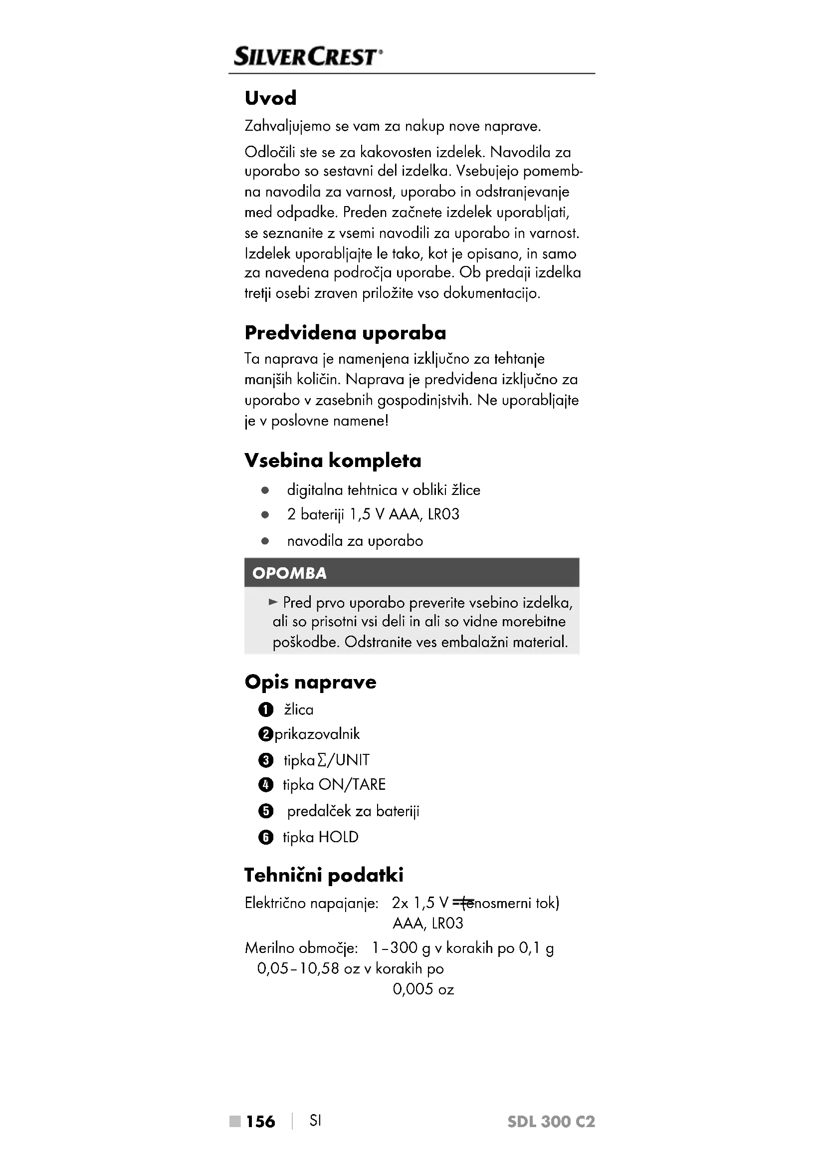 157 ■ Najv. količina pri enem merjenju: 300 g / 10,58 oz Najv. količina seštetih meritev: 3000 g / 105,8 oz Točnost merjenja: 0,1 g / 0,005 oz Vsi deli te naprave, ki pridejo v stik z živili, so primerni za živila. Varnostna navodila Pred prvo uporabo ta navodila za uporabo skrbno preberite in jih shranite za poznejšo uporabo. Ob predaji naprave tretji osebi zraven priložite tudi ta navodila. OPOZORILO! NEVARNOST TELESNIH POŠKODB! ► Pred uporabo preverite, ali so na napravi vidne morebitne zunanje poškodbe. Naprave, ki je poškodo- vana ali je padla na tla, ne uporab- ljajte. ► Otroci od 8. leta starosti naprej in osebe z zmanjšanimi telesnimi, zaznavnimi ali duševnimi sposob- nostmi ali s pomanjkljivimi izkuš- njami in znanjem smejo napravo uporabljajo le pod nadzorom ali če so bili poučeni o varni uporabi naprave in so razumeli nevarnosti, ki izhajajo iz njene uporabe. Otroci se z napravo ne smejo igrati. Otroci brez nadzora ne smejo čistiti ali opravljati uporabniškega vzdrževanja naprave.SDL 300 C2 ■ 158