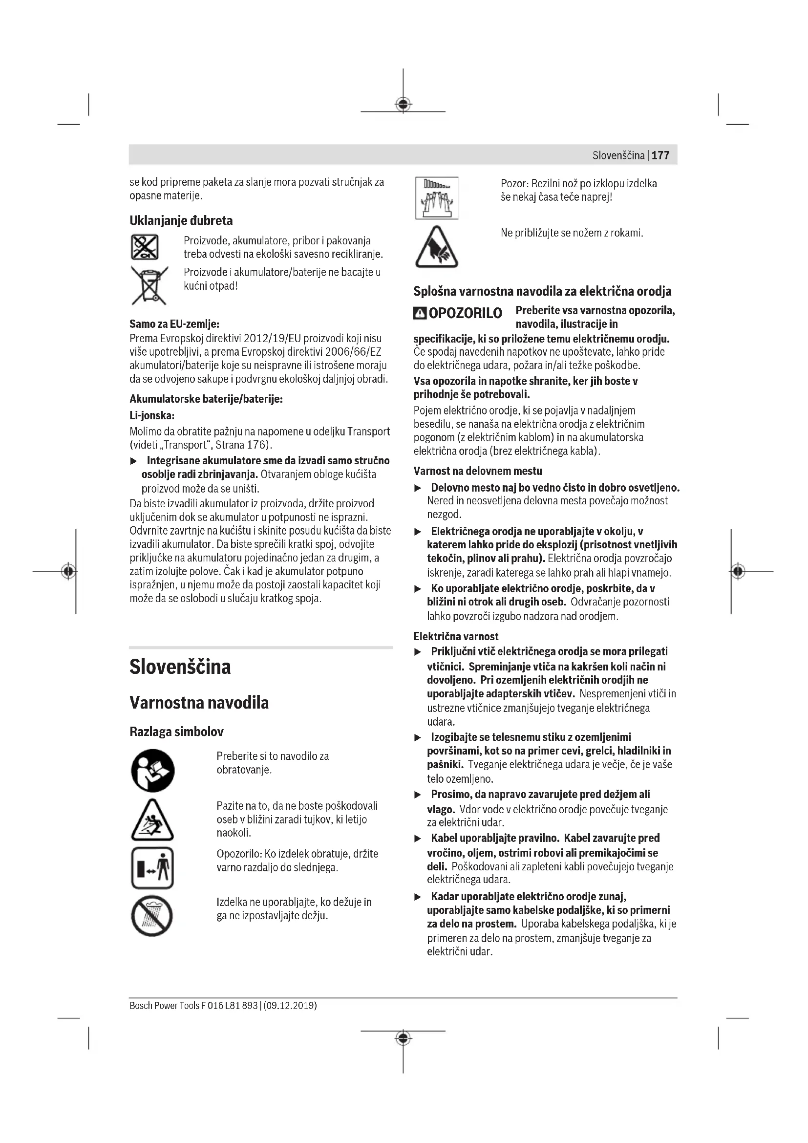 Vrednosti nivoja tresljajev in hrupa, podane v teh navodilih, so bile izmerjene v skladu s standardiziranim merilnim postopkom in se lahko uporabljajo za medsebojno primerjavo električnih orodij. Primerne so tudi za začasno oceno oddajanja tresljajev in hrupa. Bosch Power Tools F 016 L81 893 | (09.12.2019)182 | Slovenščina Naveden nivo tresljajev in hrupa je določen na osnovi glavnih načinov uporabe električnega orodja. Pri uporabi orodja v drugačne namene, z drugačnimi nastavki ali pri nezadostnem vzdrževanju lahko nivo hrupa in tresljajev odstopa. To lahko obremenjenost s hrupom in tresljaji v celotnem obdobju uporabe občutno poveča. Za natančnejšo oceno obremenjenosti s hrupom in tresljaji morate upoštevati tudi čas, ko je orodje izklopljeno, in čas, ko orodje deluje, vendar dejansko ni v uporabi. To lahko občutno zmanjša obremenjenost s hrupom in tresljaji, ki je razporejena na celotno obdobje uporabe. Določite dodatne varnostne ukrepe za zaščito uporabnika pred vplivi tresljajev, npr. vzdrževanje električnega orodja in nastavkov, segrevanje rok, organizacija delovnih postopkov. Zagon u Uporabljajte samo polne napravev, ki so navedene v tehničnih podatkih. Samo te polnilne naprave so usklajene z litij-ionsko akumulatorsko baterijo, ki jo uporabljate s svojim izdelkom. Polnjenje akumulatorske baterije (glejte sliko B) Opozorilo: Akumulatorska baterija je pri dobavi delno napolnjena. Da bi lahko akumulatorska baterija razvila svojo polno zmogljivost, jo morate pred prvo uporabo v celoti napolniti v polnilni napravi. Litij-ionsko akumulatorsko baterijo lahko kadarkoli napolnite, ne da bi pri tem skrajšali življenjsko dobo. Prekinitev postopka polnjenja akumulatorske baterije ne poškoduje. Litij-ionska akumulatorska baterija je zaščitena pred prekomerno izpraznitvijo s sistemom elektronske zaščite celic "Electronic Cell Protection (ECP)". Pri izpraznjeni akumulatorski bateriji zaščitno stikalo izklopi napravo: Vrtno orodje preneha delovati. Opozorilo: Mikro-USB-priključek (11) za priključitev mikro USB-kabla (9) se nahaja v ročaju. Akumulatorska baterija se mora napolniti, ko prikazovalnik napolnjenosti akumulatorske baterije (1) sveti rdeče. Izklopite napravo in napolnite akumulatorsko baterijo. Povežite napravo s pomočjo priloženega mikro USB-kabla (9) s polnilno napravo (10). Vtaknite polnilno napravo (10) v vtičnico. Polnjenje se začne. Med postopkom polnjenja se ročaj naprave segreje. To je normalno. Prikaz stanja napolnjenosti akum. baterije (1) med postopkom polnjenja sveti trajno rdeče. Če je akumulatorska baterija do konca napolnjena, se prikazovalnik napolnjenosti akumulatorske baterije (1) izklopi. Ko je polnilni postopek končan, ločite polnilno napravo z električnega omrežja. Upoštevajte navodila za odstranjevanje. Montaža/demontaža rezilnih nožev (glejte slike