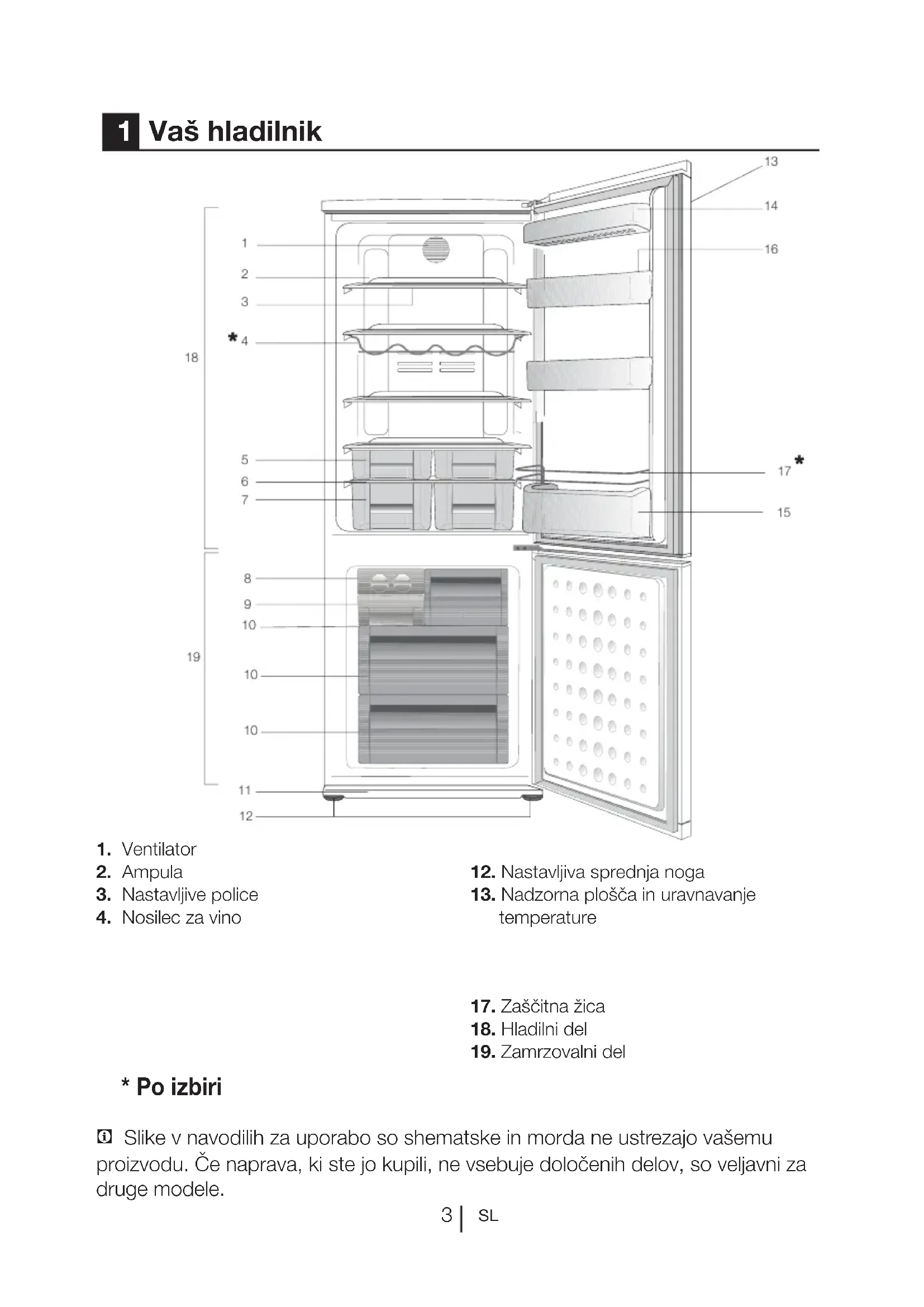 1 Vaš hladilnik C Slike v navodilih za uporabo so shematske in morda ne ustrezajo vašemu proizvodu. Če naprava, ki ste jo kupili, ne vsebuje določenih delov, so veljavni za druge modele.