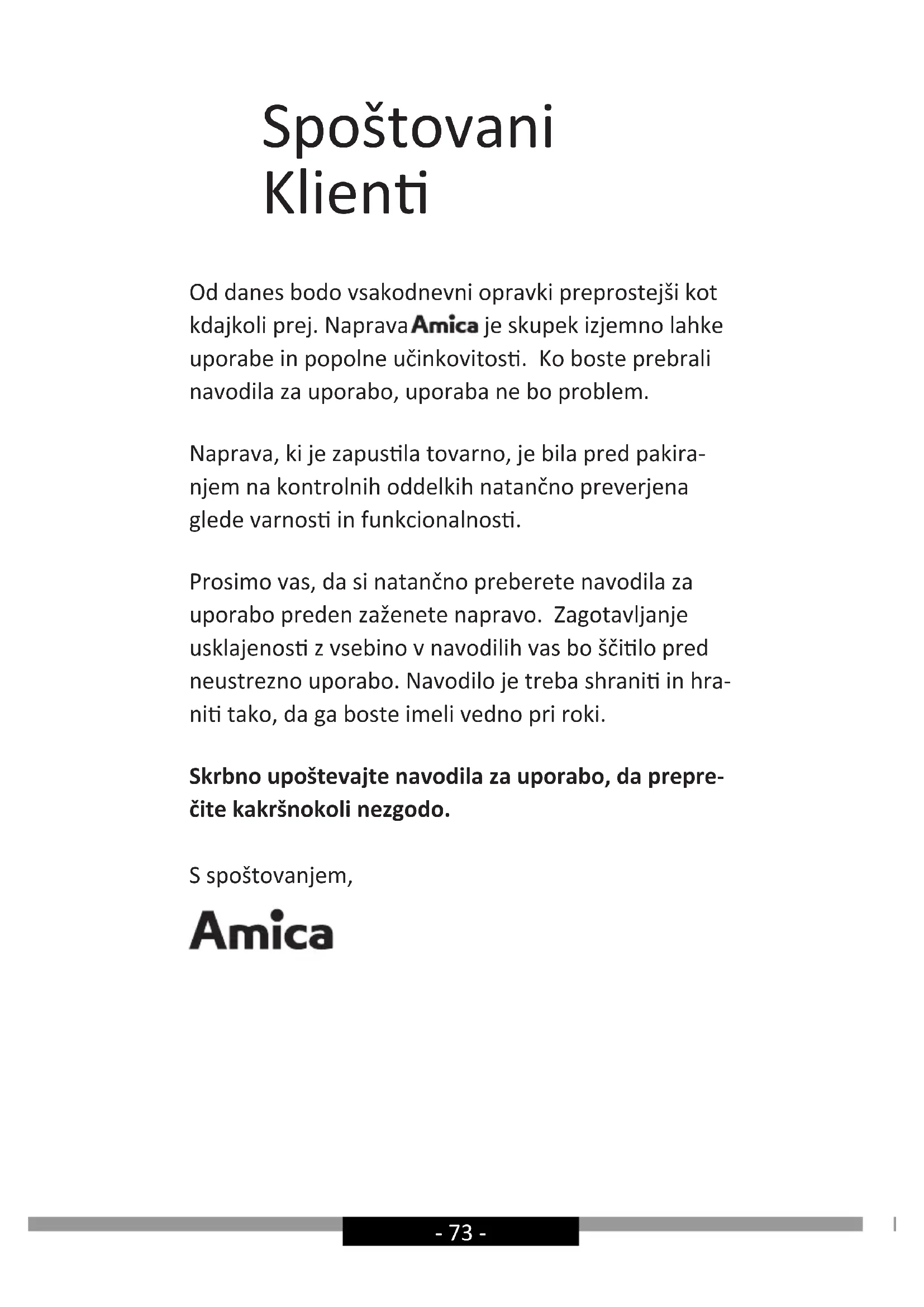 - uredbe RoHS 2011/65/EC i zato je proizvod označen te je izdana izjava o sukladnosti koja je dostupna ustanovama za nadzor tržišta.- 73 - Spoštovani Klien Od danes bodo vsakodnevni opravki preprostejši kot kdajkoli prej. Naprava je skupek izjemno lahke uporabe in popolne učinkovitos. Ko boste prebrali navodila za uporabo, uporaba ne bo problem. Naprava, ki je zapusla tovarno, je bila pred pakira- njem na kontrolnih oddelkih natančno preverjena glede varnos in funkcionalnos. Prosimo vas, da si natančno preberete navodila za uporabo preden zaženete napravo. Zagotavljanje usklajenos z vsebino v navodilih vas bo ščilo pred neustrezno uporabo. Navodilo je treba shrani in hra- ni tako, da ga boste imeli vedno pri roki. Skrbno upoštevajte navodila za uporabo, da prepre- čite kakršnokoli nezgodo. S spoštovanjem,- 74 -