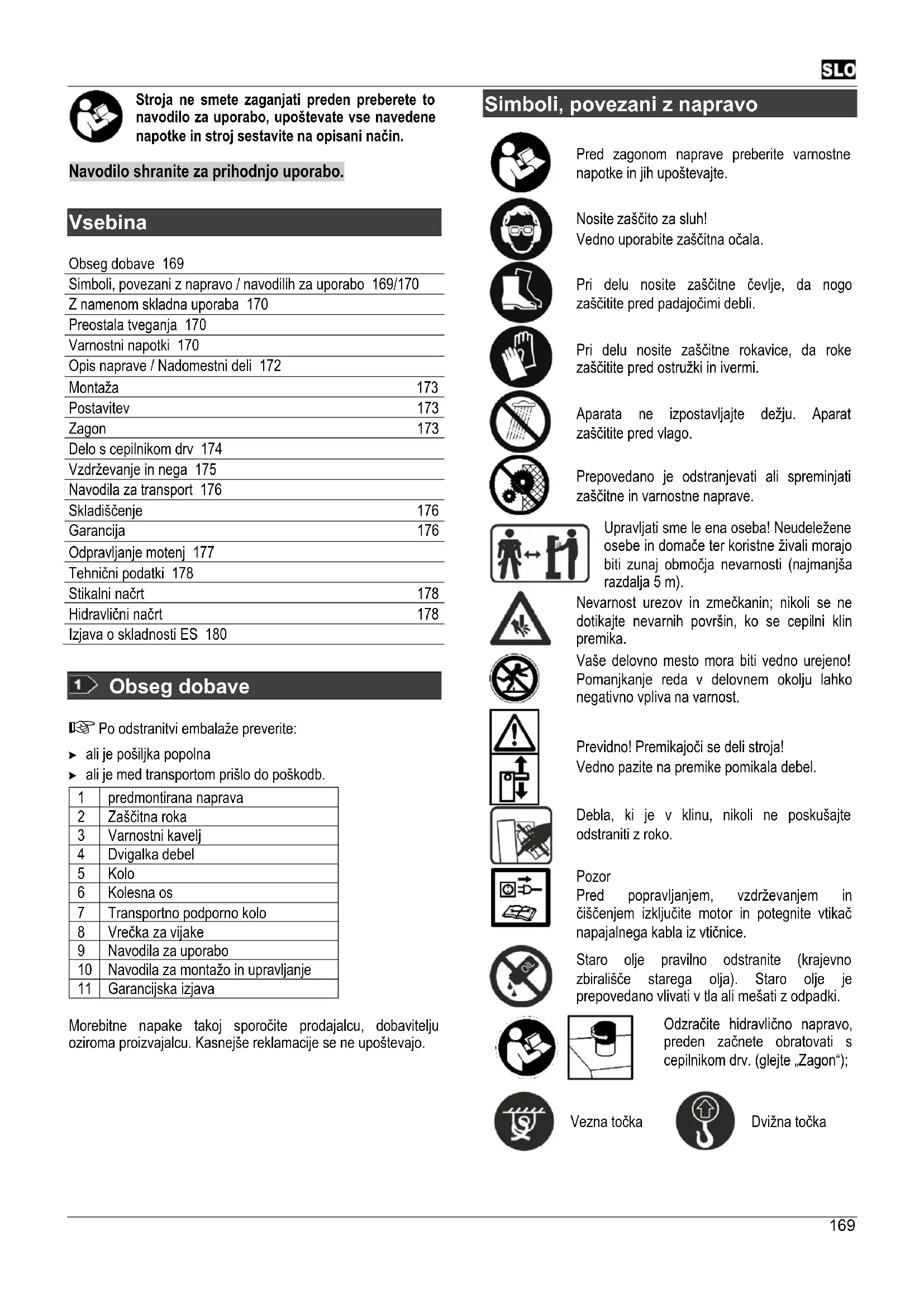 Vsebina Obseg dobave 169 Simboli, povezani z napravo / navodilih za uporabo 169/170 Z namenom skladna uporaba 170 Preostala tveganja 170 Varnostni napotki 170 Opis naprave / Nadomestni deli 172 Montaža 173 Postavitev 173 Zagon 173 Delo s cepilnikom drv 174 Vzdrževanje in nega 175 Navodila za transport 176 Skladiščenje 176 Garancija 176 Odpravljanje motenj 177 Tehnični podatki 178 Stikalni načrt 178 Hidravlični načrt 178 Izjava o skladnosti ES 180