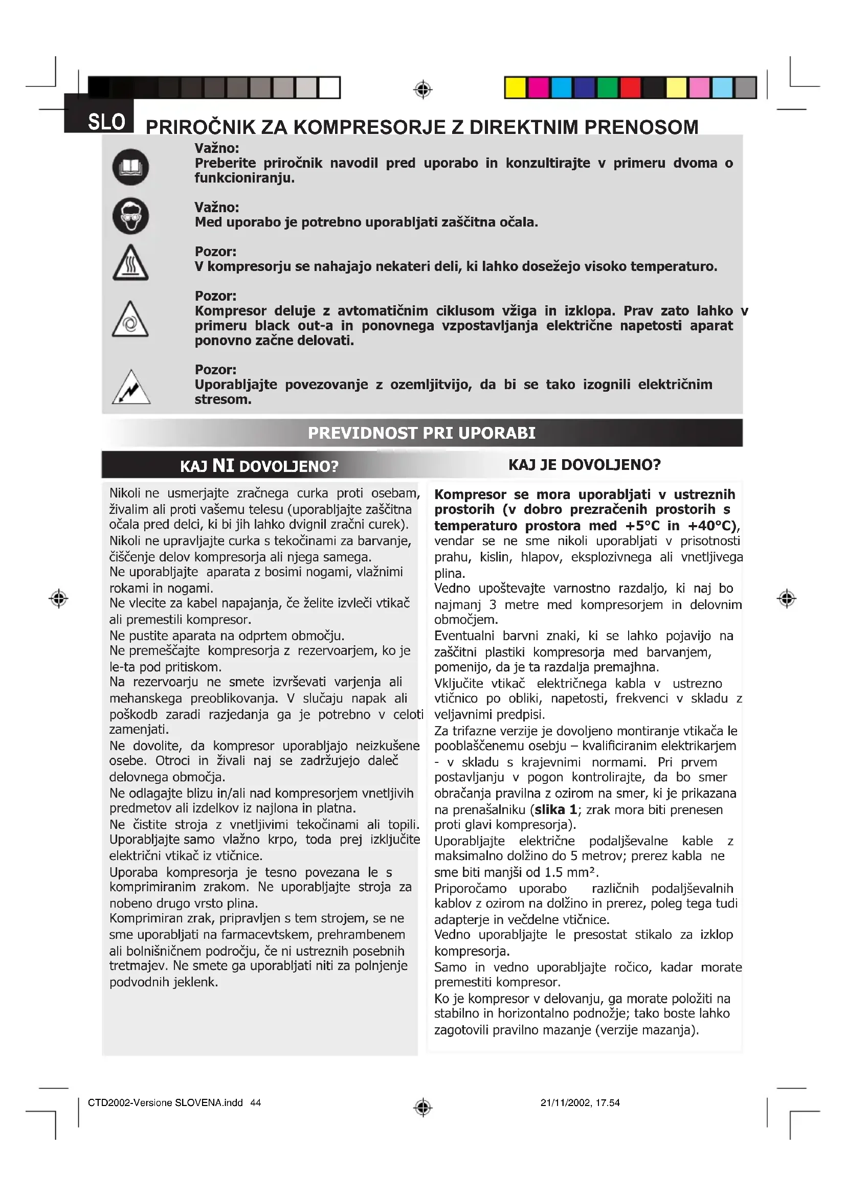 Nikoli ne usmerjajte zračnega curka proti osebam, živalim ali proti vašemu telesu (uporabljajte zaščitna očala pred delci, ki bi jih lahko dvignil zračni curek).Nikoli ne upravljajte curka s tekočinami za barvanje, čiščenje delov kompresorja ali njega samega.Ne uporabljajte aparata z bosimi nogami, vlažnimi rokami in nogami.Ne vlecite za kabel napajanja, če želite izvleči vtikač ali premestili kompresor.Ne pustite aparata na odprtem območju.Ne premeščajte kompresorja z rezervoarjem, ko je le-ta pod pritiskom.Na rezervoarju ne smete izvrševati varjenja ali mehanskega preoblikovanja. V slučaju napak ali poškodb zaradi razjedanja ga je potrebno v celoti zamenjati.Ne dovolite, da kompresor uporabljajo neizkušene osebe. Otroci in živali naj se zadržujejo daleč delovnega območja. Ne odlagajte blizu in/ali nad kompresorjem vnetljivih predmetov ali izdelkov iz najlona in platna.Ne čistite stroja z vnetljivimi tekočinami ali topili. Uporabljajte samo vlažno krpo, toda prej izključite električni vtikač iz vtičnice.Uporaba kompresorja je tesno povezana le s komprimiranim zrakom. Ne uporabljajte stroja za nobeno drugo vrsto plina.Komprimiran zrak, pripravljen s tem strojem, se ne sme uporabljati na farmacevtskem, prehrambenem ali bolnišničnem področju, če ni ustreznih posebnih tretmajev. Ne smete ga uporabljati niti za polnjenje podvodnih jeklenk.Kompresor se mora uporabljati v ustreznih prostorih (v dobro prezračenih prostorih s temperaturo prostora med +5°C in +40°C), vendar se ne sme nikoli uporabljati v prisotnosti prahu, kislin, hlapov, eksplozivnega ali vnetljivega plina. Vedno upoštevajte varnostno razdaljo, ki naj bo najmanj 3 metre med kompresorjem in delovnim območjem. Eventualni barvni znaki, ki se lahko pojavijo na zaščitni plastiki kompresorja med barvanjem, pomenijo, da je ta razdalja premajhna.Vključite vtikač električnega kabla v ustrezno vtičnico po obliki, napetosti, frekvenci v skladu z veljavnimi predpisi.Za trifazne verzije je dovoljeno montiranje vtikača le pooblaščenemu osebju – kvaliciranim elektrikarjem - v skladu s krajevnimi normami. Pri prvem postavljanju v pogon kontrolirajte, da bo smer obračanja pravilna z ozirom na smer, ki je prikazana na prenašalniku (slika 1; zrak mora biti prenesen proti glavi kompresorja). Uporabljajte električne podaljševalne kable z maksimalno dolžino do 5 metrov; prerez kabla ne sme biti manjši od 1.5 mm². Priporočamo uporabo različnih podaljševalnih kablov z ozirom na dolžino in prerez, poleg tega tudi adapterje in večdelne vtičnice. Vedno uporabljajte le presostat stikalo za izklop kompresorja.Samo in vedno uporabljajte ročico, kadar morate premestiti kompresor.Ko je kompresor v delovanju, ga morate položiti na stabilno in horizontalno podnožje; tako boste lahko zagotovili pravilno mazanje (verzije mazanja).KAJ JE DOVOLJENO?KAJ NI DOVOLJENO? PRIROČNIK ZA KOMPRESORJE Z DIREKTNIM PRENOSOM CTD2002-Versione SLOVENA.indd 21/11/2002, 17.5444I SLO KAJ MORATE VEDETI? Ta kompresor je napravljen za funkcioniranje z razmero intermitence, ki je na poseben način prikazana na tehnični tablici (na primer: S3-25 pomeni 2.5 minut dela in 7.5 minut počivanja); tako se izognemo prevelikemu pregrevanju električnega motorja. Če bi do tega vseeno prišlo, bi posredovala toplotna zaščita, ki jo ima motor; le-ta avtomatično prekine električno napetost, kadar je temperatura previsoka. Ko se vzpostavijo normalni pogoji temperature motorja, se le-ta ponovno prižge. Pri nekaterih verzijah «V» je potrebno ročno posredovati tako, da pritisnete na gumb za ponovno postavljanje v pogon, ki se nahaja na škatli za stičnike motorja (slika 2). Za lažje ponovno postavljanje v pogon stroja je pomembno, da poleg že prikazanih operacij intervenirate tudi na presostat stikala tako, da ga premestite iz položaja ugasnjeno v položaj prižgano (slike 3-4-5). Pri trifaznih verzijah je dovolj, da ročno posredujete na gumbu presostata tako, da ga postavite v položaj prižgano (slika 4). Enofazne verzije imajo presostat z enim ventilom za izpraznjevanje zraka z zapoznelim zapiranjem; le-ta olajša pogon motorja. Zato je povsem normalno, če iz rezervoarja izide majhen izpuh zraka še nekaj sekund potem. Vsi kompresorji imajo varnostni ventil, ki posreduje v primeru nepravilnega delovanja presostata in s tem zagotavlja varnost stroju. Med montiranjem katerega od priborov je nujno potrebno prekiniti izhajanje zraka. Uporaba komprimiranega zraka v različnih oblikah (pri polnjenju gum, pnevmatičnem orodju, barvanju, pranju z detergenti ali z vodo…) zahteva dobro poznavanje uporabe in dosledno spoštovanje predvidenih norm za posamezne primere.