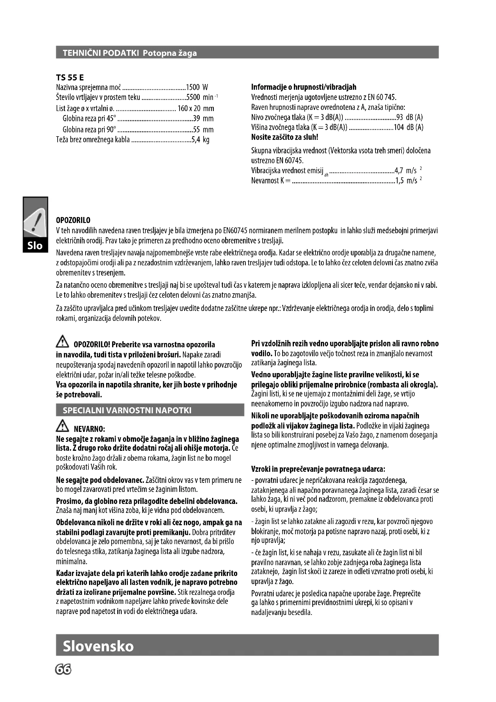 NEVARNO: Ne segajte z rokami v območje žaganja in v bližino žaginega lista. Z drugo roko držite dodatni ročaj ali ohišje motorja. Če boste krožno žago držali z obema rokama, žagin list ne bo mogel poškodovati Vaših rok. Ne segajte pod obdelovanec. Zaščitni okrov vas v tem primeru ne bo mogel zavarovati pred vrtečim se žaginim listom. Prosimo, da globino reza prilagodite debelini obdelovanca. Znaša naj manj kot višina zoba, ki je vidna pod obdelovancem. Obdelovanca nikoli ne držite v roki ali čez nogo, ampak ga na stabilni podlagi zavarujte proti premikanju. Dobra pritrditev obdelovanca je zelo pomembna, saj je tako nevarnost, da bi prišlo do telesnega stika, zatikanja žaginega lista ali izgube nadzora, minimalna. Kadar izvajate dela pri katerih lahko orodje zadane prikrito električno napeljavo ali lasten vodnik, je napravo potrebno držati za izolirane prijemalne površine. Stik rezalnega orodja z napetostnim vodnikom napeljave lahko privede kovinske dele naprave pod napetost in vodi do električnega udara. Pri vzdolžnih rezih vedno uporabljajte prislon ali ravno robno vodilo. To bo zagotovilo večjo točnost reza in zmanjšalo nevarnost zatikanja žaginega lista. Vedno uporabljajte žagine liste pravilne velikosti, ki se prilegajo obliki prijemalne prirobnice (rombasta ali okrogla). Žagini listi, ki se ne ujemajo z montažnimi deli žage, se vrtijo neenakomerno in povzročijo izgubo nadzora nad napravo. Nikoli ne uporabljajte poškodovanih oziroma napačnih podložk ali vijakov žaginega lista. Podložke in vijaki žaginega lista so bili konstruirani posebej za Vašo žago, z namenom doseganja njene optimalne zmogljivost in varnega delovanja. Vzroki in preprečevanje povratnega udarca: - povratni udarec je nepričakovana reakcija zagozdenega, zataknjenega ali napačno poravnanega žaginega lista, zaradi česar se lahko žaga, ki ni več pod nadzorom, premakne iz obdelovanca proti osebi, ki upravlja z žago; - žagin list se lahko zatakne ali zagozdi v rezu, kar povzroči njegovo blokiranje, moč motorja pa potisne napravo nazaj, proti osebi, ki z njo upravlja; - če žagin list, ki se nahaja v rezu, zasukate ali če žagin list ni bil pravilno naravnan, se lahko zobje zadnjega roba žaginega lista zataknejo, žagin list skoči iz zareze in odleti vzvratno proti osebi, ki upravlja z žago. Povratni udarec je posledica napačne uporabe žage. Preprečite ga lahko s primernimi previdnostnimi ukrepi, ki so opisani v nadaljevanju besedila. OPOZORILO V teh navodilih navedena raven tresljajev je bila izmerjena po EN60745 normiranem merilnem postopku in lahko služi medsebojni primerjavi električnih orodij. Prav tako je primeren za predhodno oceno obremenitve s tresljaji. Navedena raven tresljajev navaja najpomembnejše vrste rabe električnega orodja. Kadar se električno orodje uporablja za drugačne namene, z odstopajočimi orodji ali pa z nezadostnim vzdrževanjem, lahko raven tresljajev tudi odstopa. Le to lahko čez celoten delovni čas znatno zviša obremenitev s tresenjem. Za natančno oceno obremenitve s tresljaji naj bi se upošteval tudi čas v katerem je naprava izklopljena ali sicer teče, vendar dejansko ni v rabi. Le to lahko obremenitev s tresljaji čez celoten delovni čas znatno zmanjša. Za zaščito upravljalca pred učinkom tresljajev uvedite dodatne zaščitne ukrepe npr.: Vzdrževanje električnega orodja in orodja, delo s toplimi rokami, organizacija delovnih potekov. TS 55 E Nazivna sprejemna moč .....................................1500 W Število vrtljajev v prostem teku ..........................5500 min
