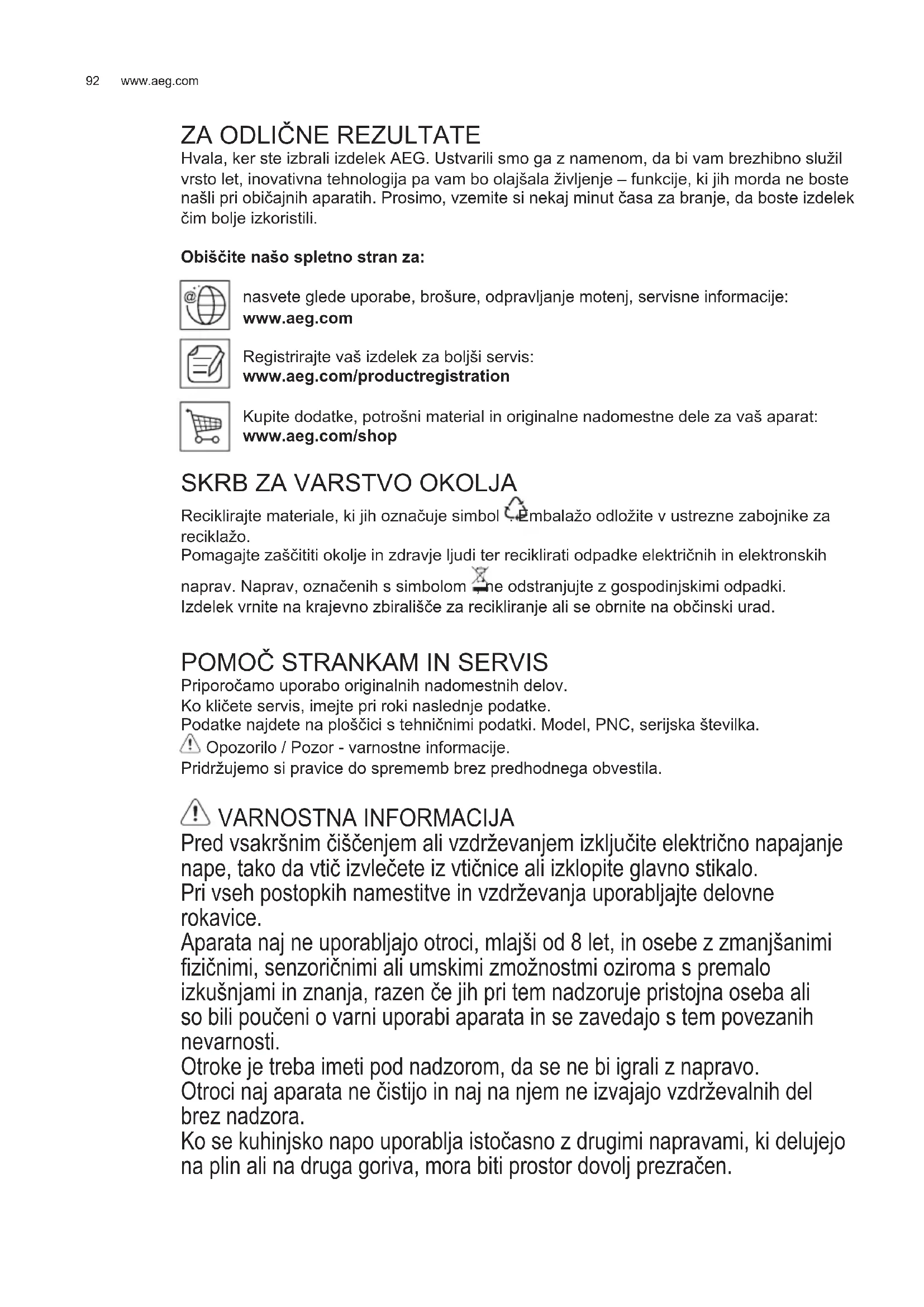 VARNOSTNA NAVODILA Pri menjavi uporabite le tip žarnice, ki je naveden v poglavju o vzdrževanju/ zamenjavi žarnice v teh navodilih. Pozor! Naprave ne priključujte na električno omrežje, dokler inštalacija ni v celoti zaključena. Kar zadeva tehnične in varnostne ukrepe za odvod dimov, morate strogo upoštevati določbe pristojnih krajevnih organov. Vsesani zrak se ne sme usmerjati v cevovod, ki služi kot odvod za pline, katere proizvajajo naprave, ki delujejo na plin ali druga goriva. Nape ne uporabljajte oziroma je ne puščajte z nepravilno nameščenimi žarnicami, saj obstaja tveganje električnega udara. Nape nikoli ne uporabljajte, če rešetka ni pravilno nameščena! Nape NIKOLI ne uporabljajte kot odlagalne površine, razen če je to izrecno dovoljeno. Za nameščanje izdelka uporabite le priložene pritrdilne vijake. Če jih ni na voljo, pa kupite pravo vrsto vijakov. Uporabite vijake prave dolžine, ki so navedeni v navodilih za namestitev. V primeru dvomov se posvetujte s pooblaščenim servisnim centrom ali s podobno usposobljeno osebo. POZOR! Če pri montaži vijakov in pritrdilnih elementov ne upoštevate teh navodil, obstaja nevarnost električnega udara. 2.UPORABA Napa odsesava dimne pline in pare, ki nastajajo med kuhanjem. V priloženem priročniku z navodili za namestitev je navedeno, katero različico lahko uporabite pri vašem modelu nape: odzračevalno ali obtočno . 3.INŠTALACIJA Omrežna napetost mora ustrezati napetosti, navedeni na nalepki z lastnostmi, nameščeni v notranjosti nape. Če ima napa vtič, slednjega vstavite v vtičnico, ki je skladna z veljavnimi predpisi in se nahaja na takem mestu, ki bo dostopno tudi po vgradnji naprave. Če napa nima vtiča (neposredna povezava na omrežje) ali se vtič nahaja na takem mestu, ki po vgradnji naprave ne bi bilo dostopno, namestite dvopolno stikalo, skladno s predpisi, ki zagotavlja popoln izklop iz omrežja v pogojih prenapetostnega razreda III, skladno s predpisi o inštalaciji. Pozor!pred ponovnim priklopom tokokroga nape na omrežno napajanje in kontrolo pravilnega delovanja, vselej preverite, ali je omrežni kabel pravilno nameščen.www.aeg.com