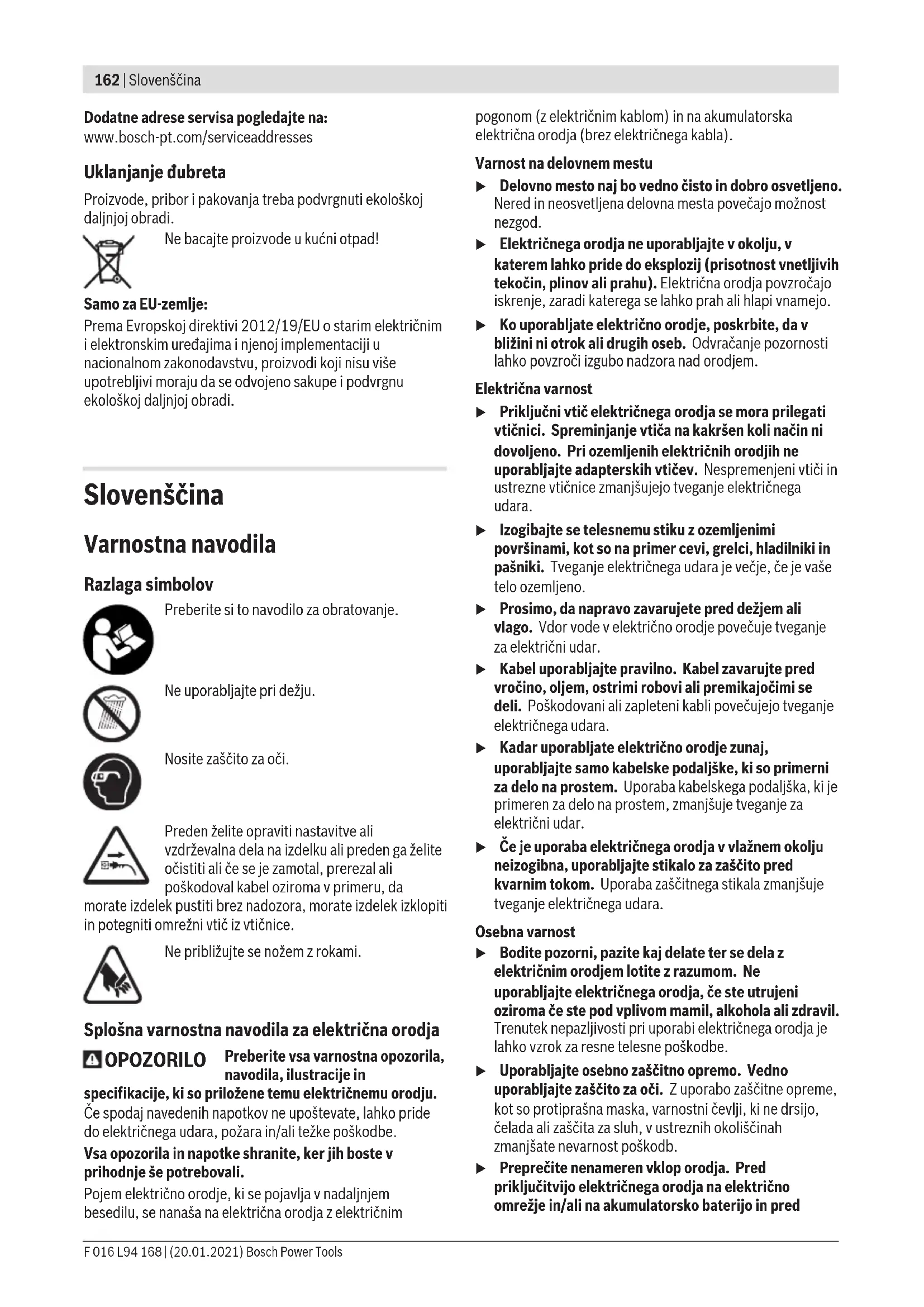Osigurač se aktivirao Zamenite osigurač Makaze za živu ogradu rade sa prekidima Interni kablovi baštenskog uređaja su u kvaru Kontaktirajte korisničku službu Prekidač za uključivanje/isključivanje je u kvaru Kontaktirajte korisničku službu Motor radi, noževi stoje Interna greška Kontaktirajte korisničku službu Nož se greje Nož je tup Naoštrite nosač noža Nož ima zarezotine Proverite nosač noža Previše trenja zbog nedovoljnog podmazivanja Poprskajte uljem za podmazivanje Jake vibracije/buka Baštenski uređaj je neispravan Kontaktirajte korisničku službu Održavanje i servisiranje Održavanje, čišćenje i skladištenje u Pre svih radova na proizvodu izvucite mrežni utikač iz utičnice. u Održavajte proizvod čistim da biste mogli dobro i sigurno da radite. Ne odlažite druge predmete na baštenski uređaj. Održavajte proizvod i proreze za provetravanje čistim da biste mogli dobro i sigurno da radite. Nikada ne prskajte proizvod vodom. Nikada ne uranjajte proizvod u vodu. Čuvajte proizvod na bezbednom i suvom mestu, van dohvata dece. Ne odlažite druge predmete na proizvod. Pazite na to da su sve navrtke, klinovi i zavrtnji pritegnuti da bi bio moguć siguran rad sa proizvodom. Proverite proizvod i radi bezbednosti zamenite istrošene ili oštećene delove. Proverite da je delove koje treba zameniti proizvela firma Bosch. Servis i saveti za upotrebu Servis odgovara na vaša pitanja u vezi sa popravkom i održavanjem vašeg proizvoda kao i u vezi sa rezervnim delovima. Šematske prikaze i informacije u vezi rezervnih delova naći ćete i pod: www.bosch-pt.com Bosch tim za konsultacije vam rado pomaže tokom primene, ukoliko imate pitanja o našim proizvodima i njihovom priboru. Molimo da kod svih pitanja i naručivanja rezervnih delova neizostavno navedete broj artikla sa 10brojčanih mesta prema tipskoj pločici proizvoda. Srpski Bosch Elektroservis Dimitrija Tucovića 59 11000 Beograd Tel.: +381 11 644 8546 Tel.: +381 11 744 3122 Tel.: +381 11 641 6291 Fax: +381 11 641 6293 E-Mail: office@servis-bosch.rs www.bosch-pt.rs Bosch Power Tools F 016 L94 168 | (20.01.2021)162 | Slovenščina Dodatne adrese servisa pogledajte na: www.bosch-pt.com/serviceaddresses Uklanjanje đubreta Proizvode, pribor i pakovanja treba podvrgnuti ekološkoj daljnjoj obradi. Ne bacajte proizvode u kućni otpad! Samo za EU‑zemlje: Prema Evropskoj direktivi 2012/19/EU o starim električnim i elektronskim uređajima i njenoj implementaciji u nacionalnom zakonodavstvu, proizvodi koji nisu više upotrebljivi moraju da se odvojeno sakupe i podvrgnu ekološkoj daljnjoj obradi. Slovenščina Varnostna navodila Razlaga simbolov Preberite si to navodilo za obratovanje. Ne uporabljajte pri dežju. Nosite zaščito za oči. Preden želite opraviti nastavitve ali vzdrževalna dela na izdelku ali preden ga želite očistiti ali če se je zamotal, prerezal ali poškodoval kabel oziroma v primeru, da morate izdelek pustiti brez nadozora, morate izdelek izklopiti in potegniti omrežni vtič iz vtičnice. Ne približujte se nožem z rokami. Splošna varnostna navodila za električna orodja OPOZORILO Preberite vsa varnostna opozorila, navodila, ilustracije in specifikacije, ki so priložene temu električnemu orodju. Če spodaj navedenih napotkov ne upoštevate, lahko pride do električnega udara, požara in/ali težke poškodbe. Vsa opozorila in napotke shranite, ker jih boste v prihodnje še potrebovali. Pojem električno orodje, ki se pojavlja v nadaljnjem besedilu, se nanaša na električna orodja z električnim pogonom (z električnim kablom) in na akumulatorska električna orodja (brez električnega kabla). Varnost na delovnem mestu u Delovno mesto naj bo vedno čisto in dobro osvetljeno. Nered in neosvetljena delovna mesta povečajo možnost nezgod. u Električnega orodja ne uporabljajte v okolju, v katerem lahko pride do eksplozij (prisotnost vnetljivih tekočin, plinov ali prahu). Električna orodja povzročajo iskrenje, zaradi katerega se lahko prah ali hlapi vnamejo. u Ko uporabljate električno orodje, poskrbite, da v bližini ni otrok ali drugih oseb. Odvračanje pozornosti lahko povzroči izgubo nadzora nad orodjem. Električna varnost u Priključni vtič električnega orodja se mora prilegati vtičnici. Spreminjanje vtiča na kakršen koli način ni dovoljeno. Pri ozemljenih električnih orodjih ne uporabljajte adapterskih vtičev. Nespremenjeni vtiči in ustrezne vtičnice zmanjšujejo tveganje električnega udara. u Izogibajte se telesnemu stiku z ozemljenimi površinami, kot so na primer cevi, grelci, hladilniki in pašniki. Tveganje električnega udara je večje, če je vaše telo ozemljeno. u Prosimo, da napravo zavarujete pred dežjem ali vlago. Vdor vode v električno orodje povečuje tveganje za električni udar. u Kabel uporabljajte pravilno. Kabel zavarujte pred vročino, oljem, ostrimi robovi ali premikajočimi se deli. Poškodovani ali zapleteni kabli povečujejo tveganje električnega udara. u Kadar uporabljate električno orodje zunaj, uporabljajte samo kabelske podaljške, ki so primerni za delo na prostem. Uporaba kabelskega podaljška, ki je primeren za delo na prostem, zmanjšuje tveganje za električni udar. u Če je uporaba električnega orodja v vlažnem okolju neizogibna, uporabljajte stikalo za zaščito pred kvarnim tokom. Uporaba zaščitnega stikala zmanjšuje tveganje električnega udara. Osebna varnost u Bodite pozorni, pazite kaj delate ter se dela z električnim orodjem lotite z razumom. Ne uporabljajte električnega orodja, če ste utrujeni oziroma če ste pod vplivom mamil, alkohola ali zdravil. Trenutek nepazljivosti pri uporabi električnega orodja je lahko vzrok za resne telesne poškodbe. u Uporabljajte osebno zaščitno opremo. Vedno uporabljajte zaščito za oči. Z uporabo zaščitne opreme, kot so protiprašna maska, varnostni čevlji, ki ne drsijo, čelada ali zaščita za sluh, v ustreznih okoliščinah zmanjšate nevarnost poškodb. u Prepr