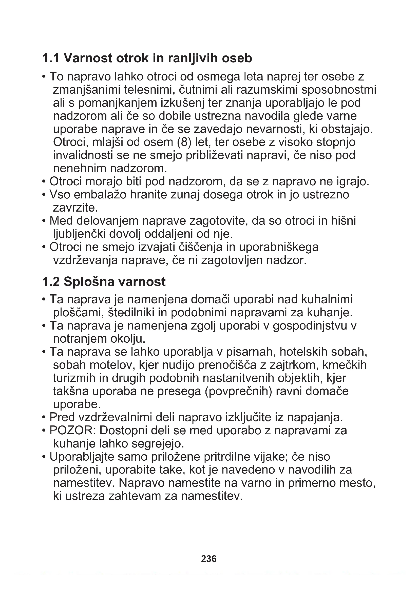 - To napravo lahko otroci od osmega leta naprej ter osebe z zmanjšanimi telesnimi, čutnimi ali razumskimi sposobnostmi ali s pomanjkanjem izkušenj ter znanja uporabljajo le pod nadzorom ali če so dobile ustrezna navodila glede varne uporabe naprave in če se zavedajo nevarnosti, ki obstajajo. Otroci, mlajši od osem (8) let, ter osebe z visoko stopnjo invalidnosti se ne smejo približevati napravi, če niso pod nenehnim nadzorom.