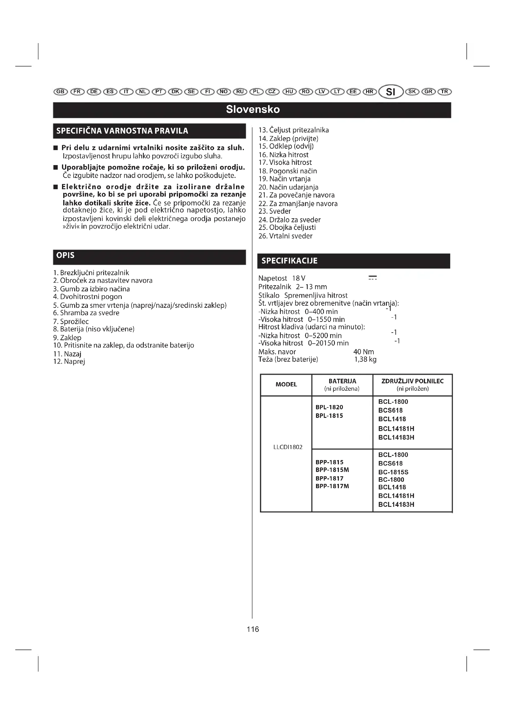 IZJAVA O SKLADNOSTINa lastno odgovornost izjavljamo, da je ta izdelek skladen z zahtevami sledečih standardov ali standariziranih dokumentov: Nivo zvočnega pritiska (K=3 dB(A)) 88.5 dB(A)Nivo zvočne moči (K=3 dB(A)) 99.5 dB(A)Utežna vrednost korenaSkupna vrednost vibracij (vektorska vsota treh smeri) določena v skladu z EN60745: Vrtanje v kovino, vrednost emisije vibracij ah,D = 1,4 m/s