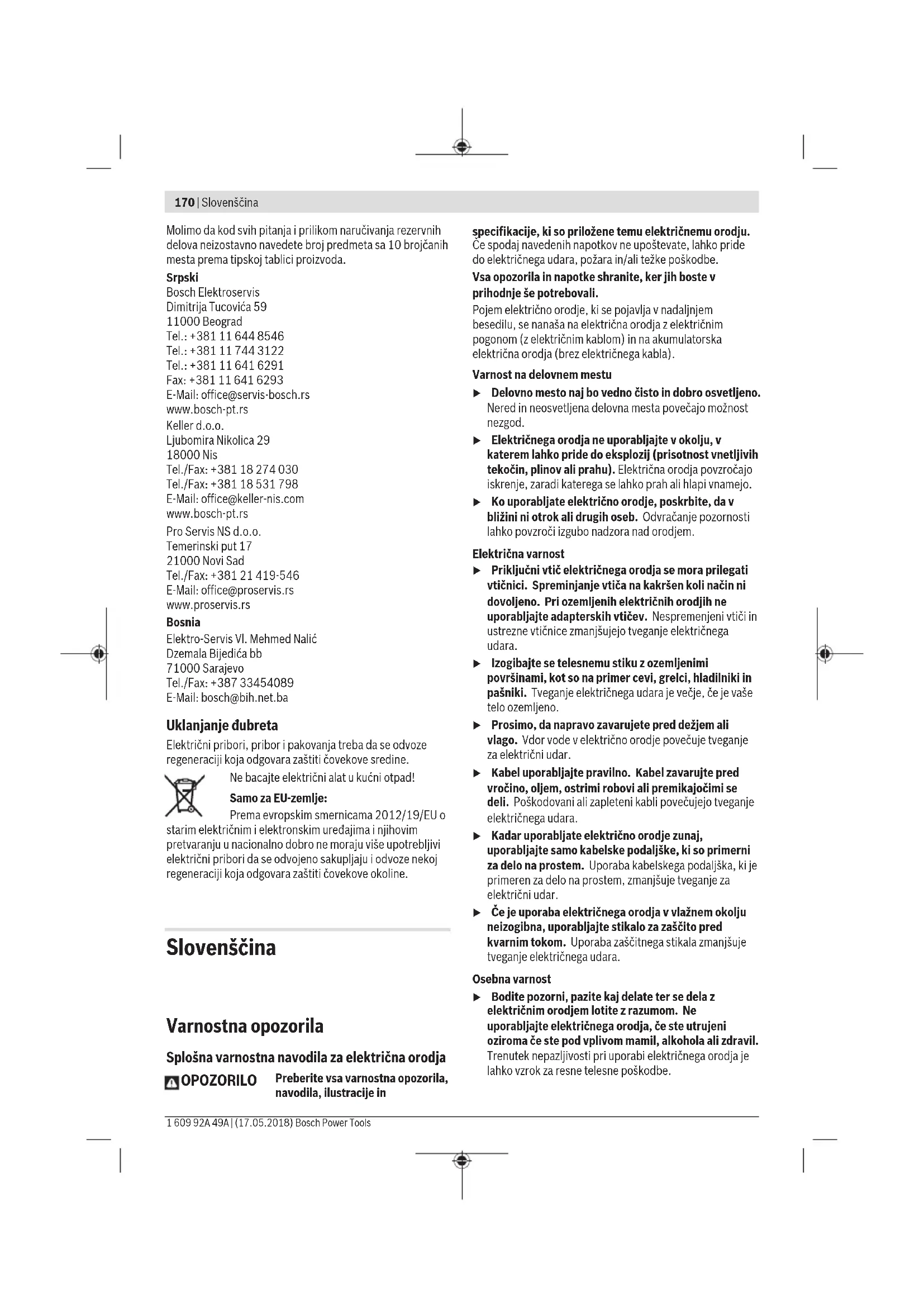 11.000–24.000 11.000–24.000 11.000–24.000 Premer nihajnega kroga mm 4 4 4 Teža po EPTA-Procedure 01:2014 kg 2,4 2,4 2,4 Zaščitni razred / II / II / II Navedbe veljajo za nazivne napetosti [U] 230V. Pri drugih napetostih in državno specifičnih izvedbah lahko te navedbe variirajo. Podatki o hrupu/tresljajih Podatki o emisijah hrupa, pridobljeni v skladu s standardom EN62841-2-4. Raven hrupa razreda A za električno orodje običajno znaša: 82 dB(A); raven zvočne moči 93 dB(A). Negotovost K= 1,5 dB. Uporabljajte zaščito za sluh! Skupne vrednosti tresljajev a