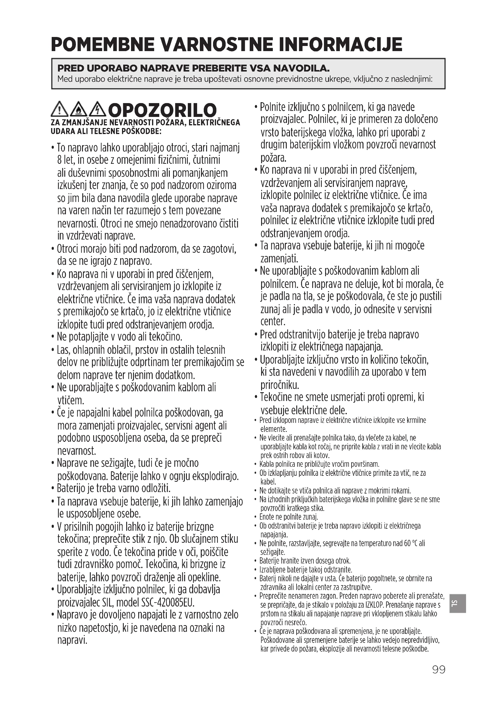 - To napravo lahko uporabljajo otroci, stari najmanj 8 let, in osebe z omejenimi fizičnimi, čutnimi ali duševnimi sposobnostmi ali pomanjkanjem izkušenj ter znanja, če so pod nadzorom oziroma so jim bila dana navodila glede uporabe naprave na varen način ter razumejo s tem povezane nevarnosti. Otroci ne smejo nenadzorovano čistiti in vzdrževati naprave.