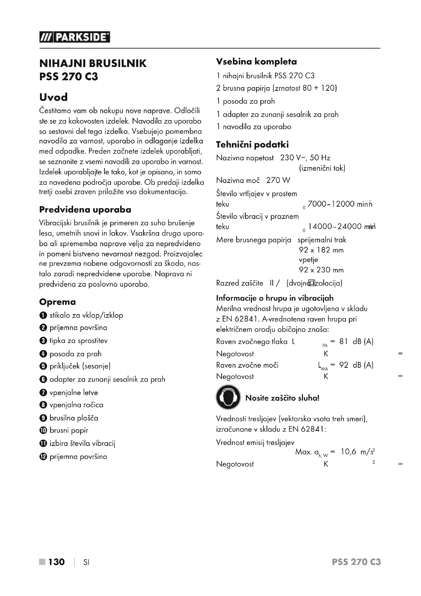 SI NIHAJNI BRUSILNIK PSS 270 C3 Uvod Čestitamo vam ob nakupu nove naprave. Odločili ste se za kakovosten izdelek. Navodila za uporabo so sestavni del tega izdelka. Vsebujejo pomembna navodila za varnost, uporabo in odlaganje izdelka med odpadke. Preden začnete izdelek uporabljati, se seznanite z vsemi navodili za uporabo in varnost. Izdelek uporabljajte le tako, kot je opisano, in samo za navedena področja uporabe. Ob predaji izdelka tretji osebi zraven priložite vso dokumentacijo. Predvidena uporaba Vibracijski brusilnik je primeren za suho brušenje lesa, umetnih snovi in lakov. Vsakršna druga upora- ba ali sprememba naprave velja za nepredvideno in pomeni bistveno nevarnost nezgod. Proizvajalec ne prevzema nobene odgovornosti za škodo, nas- talo zaradi nepredvidene uporabe. Naprava ni predvidena za poslovno uporabo. Oprema 1 stikalo za vklop/izklop 2 prijemna površina 3 tipka za sprostitev 4 posoda za prah 5 priključek (sesanje) 6 adapter za zunanji sesalnik za prah 7 vpenjalne letve 8 vpenjalna ročica 9 brusilna plošča 0 brusni papir q izbira števila vibracij w prijemna površina Vsebina kompleta 1 nihajni brusilnik PSS 270 C3 2 brusna papirja (zrnatost 80 + 120) 1 posoda za prah 1 adapter za zunanji sesalnik za prah 1 navodila za uporabo Tehnični podatki Nazivna napetost 230V∼, 50Hz (izmenični tok) Nazivna moč 270 W Število vrtljajev v prostem teku n
