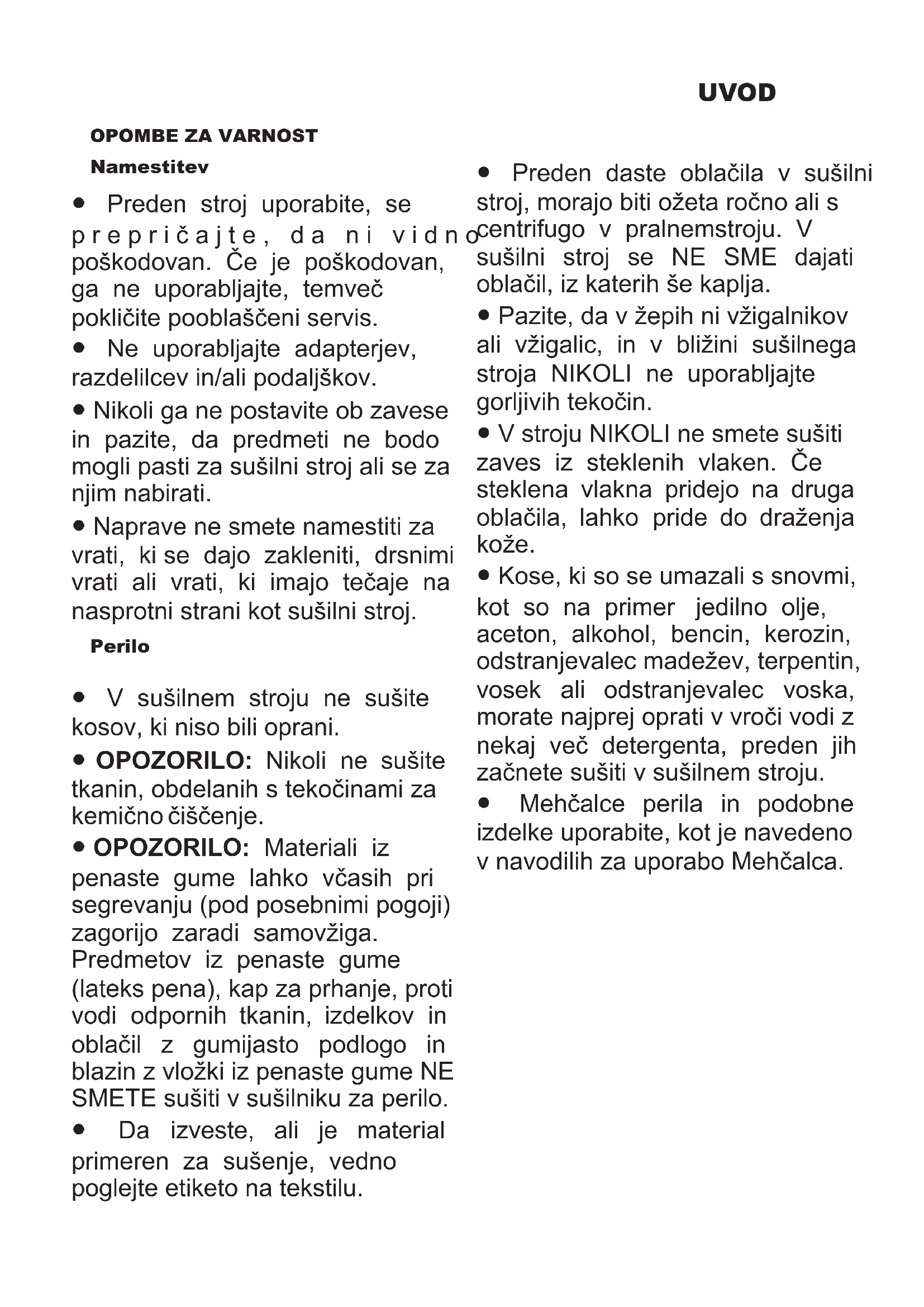 ● Preden stroj uporabite, se p r e p r i č a j t e , d a n i v i d n o poškodovan. Če je poškodovan, ga ne uporabljajte, temveč pokličite pooblaščeni servis. ● Ne uporabljajte adapterjev, razdelilcev in/ali podaljškov. ● Nikoli ga ne postavite ob zavese in pazite, da predmeti ne bodo mogli pasti za sušilni stroj ali se za njim nabirati. ● Naprave ne smete namestiti za vrati, ki se dajo zakleniti, drsnimi vrati ali vrati, ki imajo tečaje na nasprotni strani kot sušilni stroj. Namestitev ● V sušilnem stroju ne sušite kosov, ki niso bili oprani. ● OPOZORILO: Nikoli ne sušite tkanin, obdelanih s tekočinami za kemično čiščenje. ● OPOZORILO: Materiali iz penaste gume lahko včasih pri segrevanju (pod posebnimi pogoji) zagorijo zaradi samovžiga. Predmetov iz penaste gume (lateks pena), kap za prhanje, proti vodi odpornih tkanin, izdelkov in oblačil z gumijasto podlogo in blazin z vložki iz penaste gume NE SMETE sušiti v sušilniku za perilo. ● Da izveste, ali je material primeren za sušenje, vedno poglejte etiketo na tekstilu. Perilo ● Preden daste oblačila v sušilni stroj, morajo biti ožeta ročno ali s centrifugo v pralnemstroju. V sušilni stroj se NE SME dajati oblačil, iz katerih še kaplja. ● Pazite, da v žepih ni vžigalnikov ali vžigalic, in v bližini sušilnega stroja NIKOLI ne uporabljajte gorljivih tekočin. ● V stroju NIKOLI ne smete sušiti zaves iz steklenih vlaken. Če steklena vlakna pridejo na druga oblačila, lahko pride do draženja kože. ● Kose, ki so se umazali s snovmi, kot so na primer jedilno olje, aceton, alkohol, bencin, kerozin, odstranjevalec madežev, terpentin, vosek ali odstranjevalec voska, morate najprej oprati v vroči vodi z nekaj več detergenta, preden jih začnete sušiti v sušilnem stroju. ● Mehčalce perila in podobne izdelke uporabite, kot je navedeno v navodilih za uporabo Mehčalca.