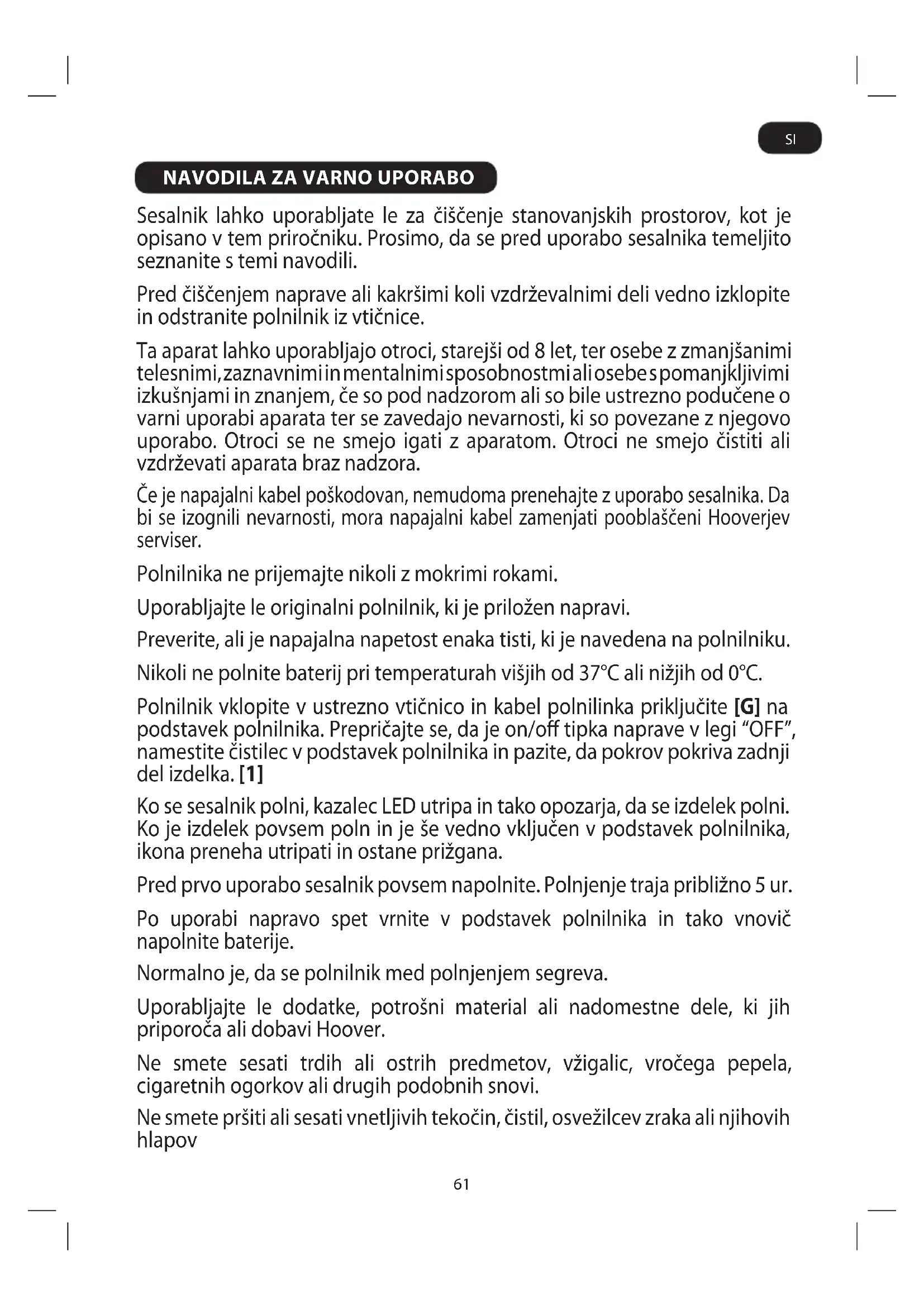 Sesalnik lahko uporabljate le za čiščenje stanovanjskih prostorov, kot je opisano v tem priročniku. Prosimo, da se pred uporabo sesalnika temeljito seznanite s temi navodili. Pred čiščenjem naprave ali kakršimi koli vzdrževalnimi deli vedno izklopite in odstranite polnilnik iz vtičnice. Ta aparat lahko uporabljajo otroci, starejši od 8 let, ter osebe z zmanjšanimi telesnimi, zaznavnimi in mentalnimi sposobnostmi ali osebe s pomanjkljivimi izkušnjami in znanjem, če so pod nadzorom ali so bile ustrezno podučene o varni uporabi aparata ter se zavedajo nevarnosti, ki so povezane z njegovo uporabo. Otroci se ne smejo igati z aparatom. Otroci ne smejo čistiti ali vzdrževati aparata braz nadzora. Če je napajalni kabel poškodovan, nemudoma prenehajte z uporabo sesalnika. Da bi se izognili nevarnosti, mora napajalni kabel zamenjati pooblaščeni Hooverjev serviser. Polnilnika ne prijemajte nikoli z mokrimi rokami. Uporabljajte le originalni polnilnik, ki je priložen napravi. Preverite, ali je napajalna napetost enaka tisti, ki je navedena na polnilniku. Nikoli ne polnite baterij pri temperaturah višjih od 37°C ali nižjih od 0°C. Polnilnik vklopite v ustrezno vtičnico in kabel polnilinka priključite [G] na podstavek polnilnika. Prepričajte se, da je on/o tipka naprave v legi “OFF”, namestite čistilec v podstavek polnilnika in pazite, da pokrov pokriva zadnji del izdelka. [1] Ko se sesalnik polni, kazalec LED utripa in tako opozarja, da se izdelek polni. Ko je izdelek povsem poln in je še vedno vključen v podstavek polnilnika, ikona preneha utripati in ostane prižgana. Pred prvo uporabo sesalnik povsem napolnite. Polnjenje traja približno 5 ur. Po uporabi napravo spet vrnite v podstavek polnilnika in tako vnovič napolnite baterije. Normalno je, da se polnilnik med polnjenjem segreva. Uporabljajte le dodatke, potrošni material ali nadomestne dele, ki jih priporoča ali dobavi Hoover. Ne smete sesati trdih ali ostrih predmetov, vžigalic, vročega pepela, cigaretnih ogorkov ali drugih podobnih snovi. Ne smete pršiti ali sesati vnetljivih tekočin, čistil, osvežilcev zraka ali njihovih hlapov SI62 Ne smete uporabljati naprave ali polnilnika, če ne delujeta pravilno. Hooverjev servis: Za zagotovitev nenehnega varnega in učinkovitega delovanja naprave priporočamo, da servis ali popravila izvrši le pooblaščeni Hooverjev serviser. Ne smete uporabljati sesalnika za čiščenje živali ali ljudi. Imejte roke, noge, ohlapna oblačila in lasje proč od vrtljivih krtač. Pogosto očistite vrečko za prah in ltrirni trak. Ne izklopite polnilca tako, da povlečete kabel. Polnilec izklopite v primeru podaljšane odsotnosti (počitnice, itd.). Pred ponovno uporabo spet napolnite baterije, ker se lahko te izpraznijo samodejno, če sesalnika dlje časa ne uporabljate. Statična elektrika: Določene vrste preprog lahko ustvarijo manjšo količino statične elektrike. Kakršen koli statični električni naboj ne ogroža zdravja. Sesalnika ne smete uporabljajti na prostem, na kakršni koli mokri površini ali za sesanje tekočin. Zamenjava baterije Zaradi varnostnih razlOgov lahko litij-ionske baterije tega sesalnika zamenja le Hooverjev strokovnjak. Ko baterije ne morejo ostati polne, vas prosimo, da se obrnete na Hooverjev center za kupce, da bi uredili zamenjavo. Ne smete zamenjati polnljivih baterij z navadnimi baterijami. Konec življenjske dobe izdelka Baterije Odstranitev Če boste napravo odvrgli, morate najprej odstraniti baterije. Ko želite odstraniti baterije, mora biti naprava izključena iz električnega toka. Baterije odvrzite na varen način. Uporabljene baterije je treba odnesti v enoto za recikliranje in se ne smejo odvreči v gospodinjske smeti. Za odstranitev baterij vas prosimo, da se obrnete na Hooverjev center za kupce ali nadaljujete po sledečih navodilih. POMEMBNO: Pred odstranjevanjem baterije vedno popolnoma izpraznite. Sesalnik naj deluje toliko časa, da se baterije do konca izpraznijo. Sprednji in zgornji pokrov odstranite z izdelka. Odvijte 7 vijake in enoto odprite. Odvijte 6 vijakov in odprite baterijo. Drugega za drugim odstranite kable, ki so povezani z baterijo, in tako preprečite možnost kratkega stika. OPOMBA: V primeru težav z razstavljanjem naprave ali za podrobnejše informacije o ravnanju z izdelkom, obnovi ali ricikliranju izdelka se obrnite na krajevni urad ali komunalno podjetje za odvoz gosodinjskih odpadkov. SI63 LASTNOSTI SHRANJEVANJE/POLNJENJE Shranjevanje Naprave Izdelek je oblikovan tako, da ga lahko odložite na podstavek za polnjenje na ploski površini ali navpično, če je nosilec pritrjen na steno. [1] Za lično shranjevanje navijte odvečno dolžino kabla na hrbtni strani polnilnika in ga napeljite na prosto ob strani ali spodaj. Ogrodje za pritrditev na steno (Potrebno orodje: izvijač in vrtalni stroj)