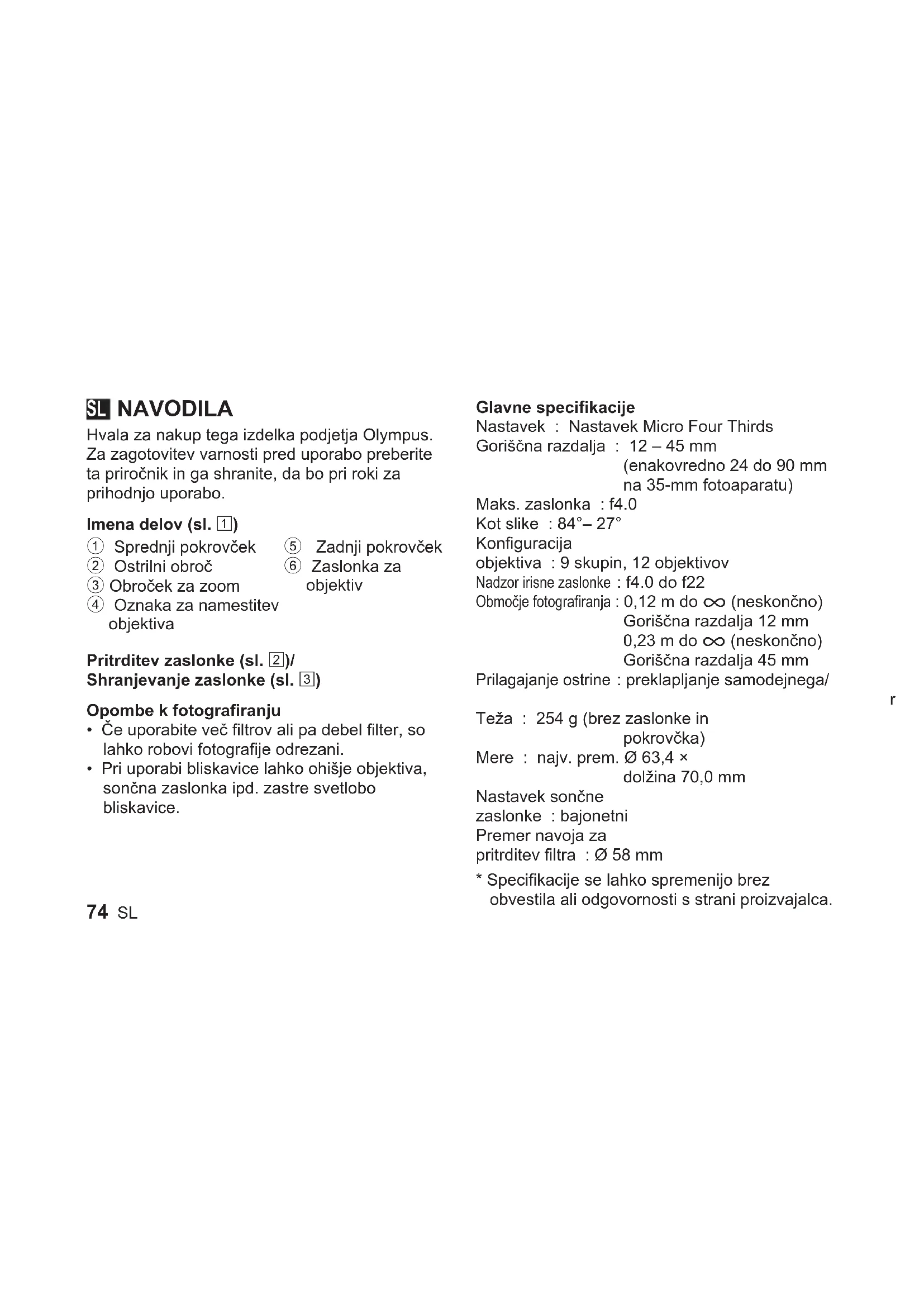 - Pri uporabi bliskavice lahko ohišje objektiva, sončna zaslonka ipd. zastre svetlobo bliskavice. Glavne specifikacije Nastavek : Nastavek Micro Four Thirds Goriščna razdalja : 12 – 45 mm (enakovredno 24 do 90 mm na 35-mm fotoaparatu) Maks. zaslonka : f4.0 Kot slike : 84°– 27° Konfiguracija objektiva : 9 skupin, 12 objektivov Nadzor irisne zaslonke : f4.0 do f22 Območje fotografiranja : 0,12 m do ) (neskončno) Goriščna razdalja 12 mm 0,23 m do ) (neskončno) Goriščna razdalja 45 mm Prilagajanje ostrine : preklapljanje samodejnega/ ročnega ostrenja Teža : 254 g (brez zaslonke in pokrovčka) Mere : najv. prem. Ø 63,4 × dolžina 70,0 mm Nastavek sončne zaslonke : bajonetni Premer navoja za pritrditev filtra : Ø 58 mm