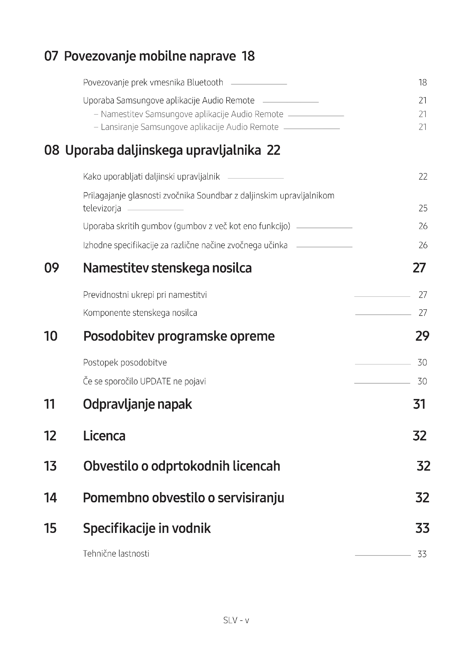 Do POPOLNI PRIROČNIK lahko dostopate na Samsungovem spletnem središču za podporo strankam, tako da optično preberete kodo QR. Če si priročnik želite ogledati v računalniku ali mobilni napravi, ga s Samsungovega spletnega mesta prenesite v obliki dokumenta. (http://www.samsung.com/support) Oblika in specikacije se lahko spremenijo brez predhodnega opozorila.SLV - iv VSEBINA 01 Preverjanje komponent 2 Vstavljanje baterij pred uporabo daljinskega upravljalnika (2 bateriji AA) ------------------------- 2 02 Pregled izdelka 3 Sprednja plošča/desna plošča zvočnika Soundbar