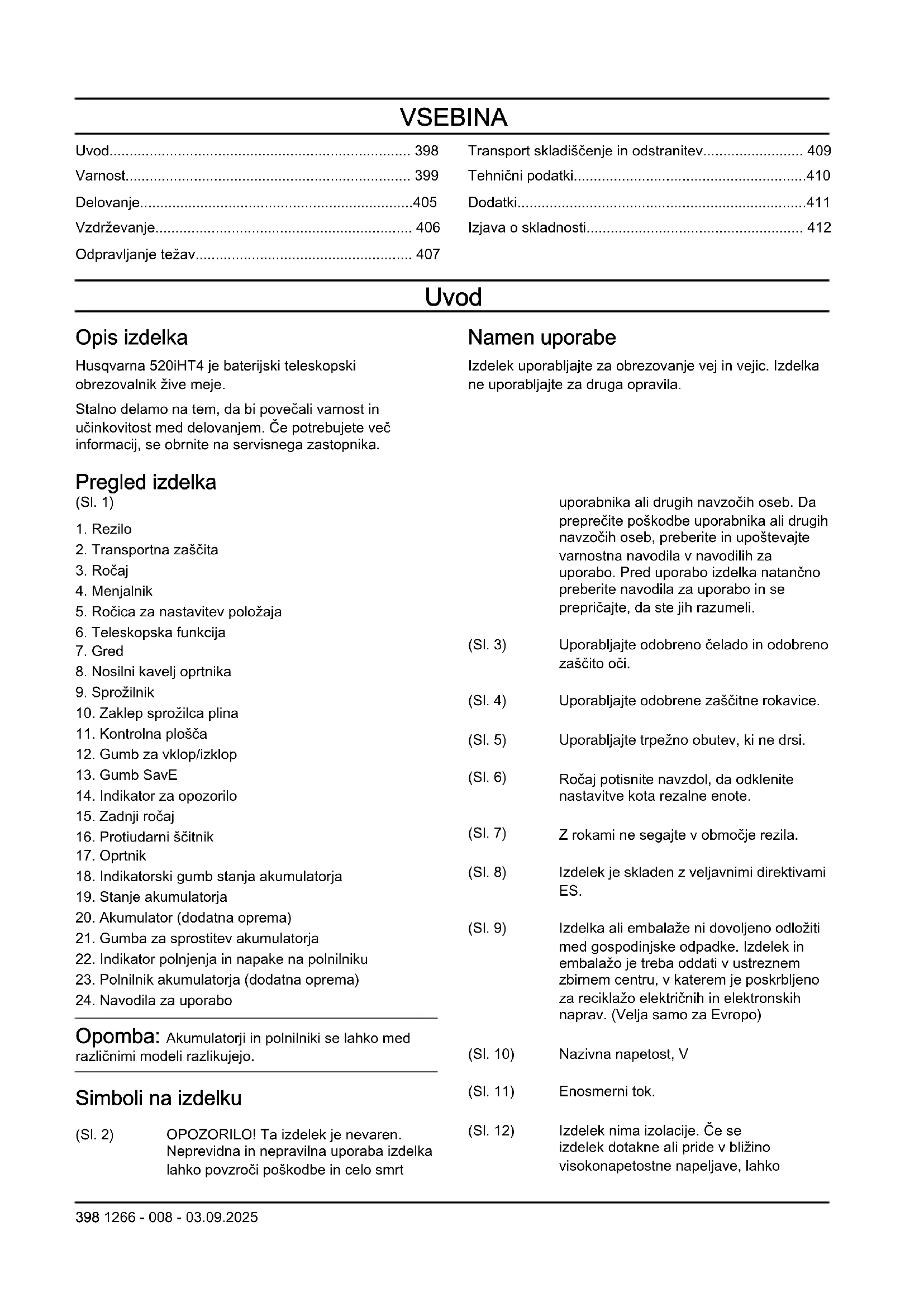 Opomba: Akumulatorji in polnilniki se lahko med različnimi modeli razlikujejo. Simboli na izdelku (Sl. 2) OPOZORILO! Ta izdelek je nevaren. Neprevidna in nepravilna uporaba izdelka lahko povzroči poškodbe in celo smrt uporabnika ali drugih navzočih oseb. Da preprečite poškodbe uporabnika ali drugih navzočih oseb, preberite in upoštevajte varnostna navodila v navodilih za uporabo. Pred uporabo izdelka natančno preberite navodila za uporabo in se prepričajte, da ste jih razumeli. (Sl. 3) Uporabljajte odobreno čelado in odobreno zaščito oči. (Sl. 4) Uporabljajte odobrene zaščitne rokavice. (Sl. 5) Uporabljajte trpežno obutev, ki ne drsi. (Sl. 6) Ročaj potisnite navzdol, da odklenite nastavitve kota rezalne enote. (Sl. 7) Z rokami ne segajte v območje rezila. (Sl. 8) Izdelek je skladen z veljavnimi direktivami ES. (Sl. 9) Izdelka ali embalaže ni dovoljeno odložiti med gospodinjske odpadke. Izdelek in embalažo je treba oddati v ustreznem zbirnem centru, v katerem je poskrbljeno za reciklažo električnih in elektronskih naprav. (Velja samo za Evropo) (Sl. 10) Nazivna napetost, V (Sl. 11) Enosmerni tok. (Sl. 12) Izdelek nima izolacije. Če se izdelek dotakne ali pride v bližino visokonapetostne napeljave, lahko 398 1266 - 008 - 03.09.2025povzroči smrt ali hude telesne poškodbe. Električni tok lahko v loku preskoči iz ene točke v drugo. Pri višji napetosti tok lahko preskoči daljšo razdaljo. Električni tok lahko potuje skozi veje in druge predmete, zlasti če so mokri. Vedno zagotovite minimalno razdaljo 10m med izdelkom in visokonapetostno napeljavo in/ali vsemi predmeti, ki se dotikajo visokonapetostne napeljave. V primeru, ko je potrebno delo znotraj te varne razdalje, se pred začetkom del vedno obrnite na pristojno energetsko podjetje, ki poskrbi za izklop napetosti. Med delom bodi najmanj 15m oddaljeni od drugih oseb ali živali. (Sl. 13) Zaščiten pred pljuski vode. yyyywwxxxx Na tipski ploščici je navedena serijska številka. yyyy je proizvodno leto, ww je proizvodni teden in xxxx je serijska številka. Opomba: Ostali simboli in oznake na izdelku se nanašajo na zahteve za certifikacijo, ki veljajo za nekatere trge. Simboli na bateriji in/ali polnilniku baterije (Sl. 17) Izdelek je treba reciklirati v zbir- nem centru za reciklažo elek- trične in elektronske opreme. (velja samo za Evropo) (Sl. 14) Pretvornik za varno odpoved. (Sl. 15) Polnilnik baterije hranite in uporabljajte samo v zaprtih prostorih. (Sl. 16) Dvojna izolacija. Škoda izdelka Za škodo na izdelku ne odgovarjamo, če: