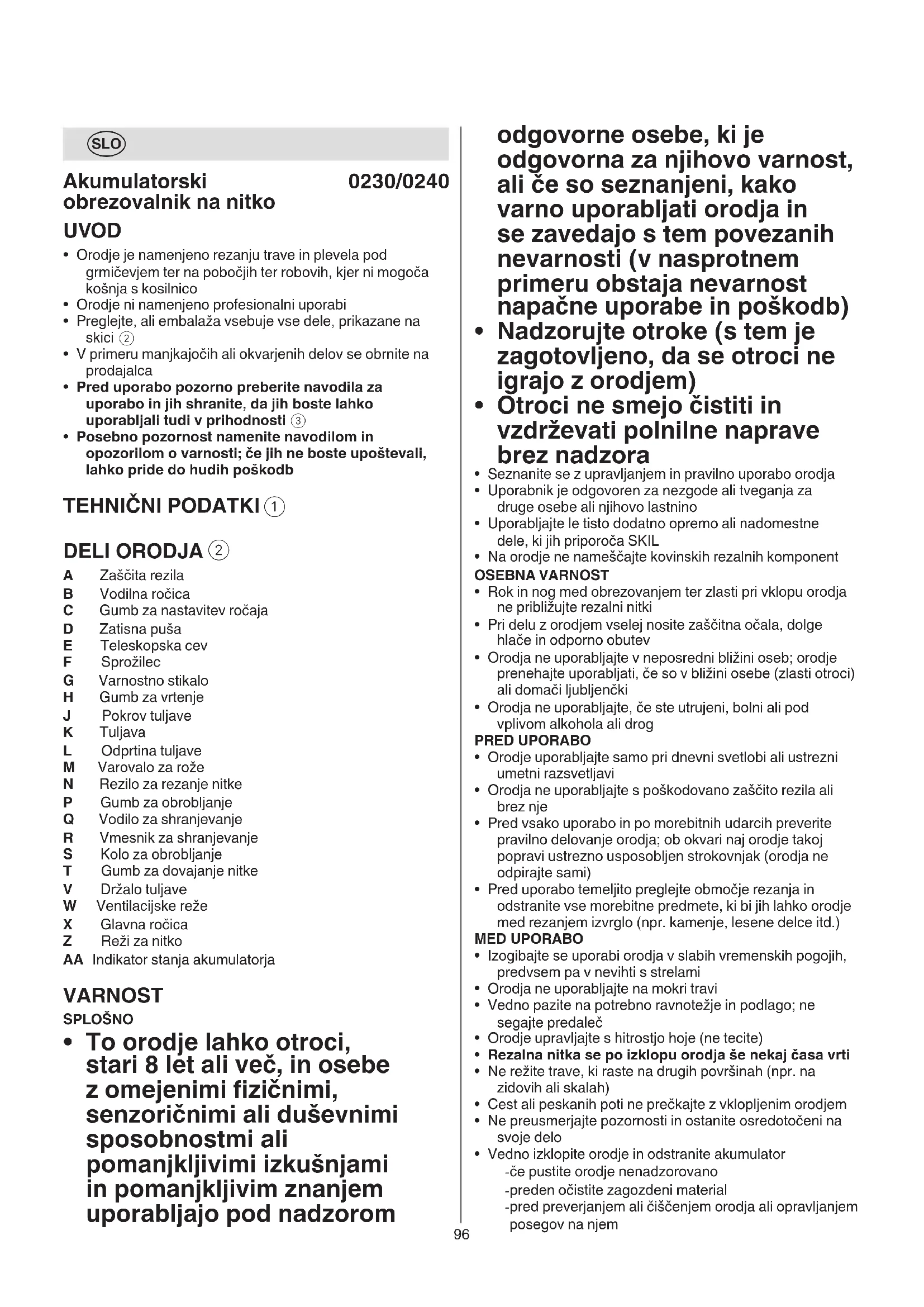 Prenesite navodila za vaš Trimer za travo v formatu PDF brezplačno! Poiščite svoja navodila 0240 CA - SKIL in vzemite svojo elektronsko napravo nazaj v roke. Na tej strani so objavljeni vsi dokumenti, potrebni za uporabo vaše naprave. 0240 CA znamke SKIL.