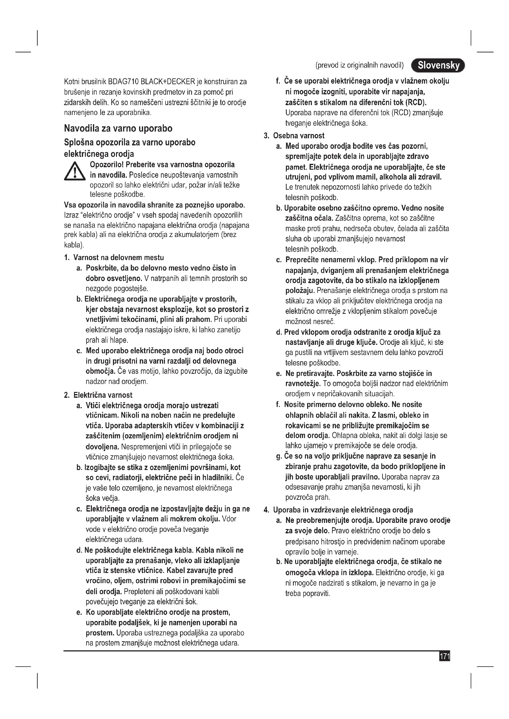 (prevod iz originalnih navodil) Slovensky (prevod iz originalnih navodil) Kotni brusilnik BDAG710 BLACK+DECKER je konstruiran za brušenje in rezanje kovinskih predmetov in za pomoč pri zidarskih delih. Ko so nameščeni ustrezni ščitniki je to orodje namenjeno le za uporabnika. Navodila za varno uporabo Splošna opozorila za varno uporabo električnega orodja