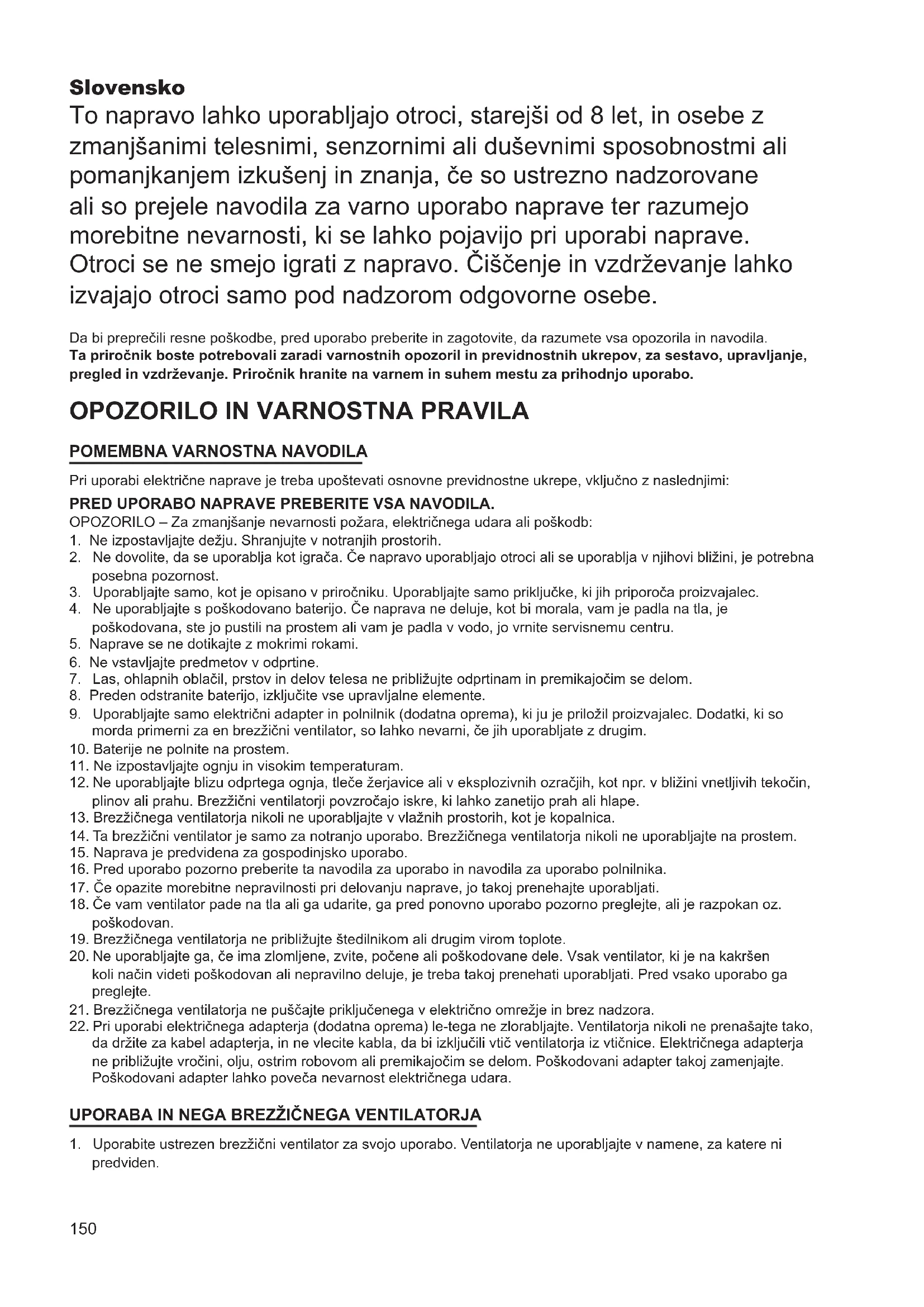 18. Če vam ventilator pade na tla ali ga udarite, ga pred ponovno uporabo pozorno preglejte, ali je razpokan oz.